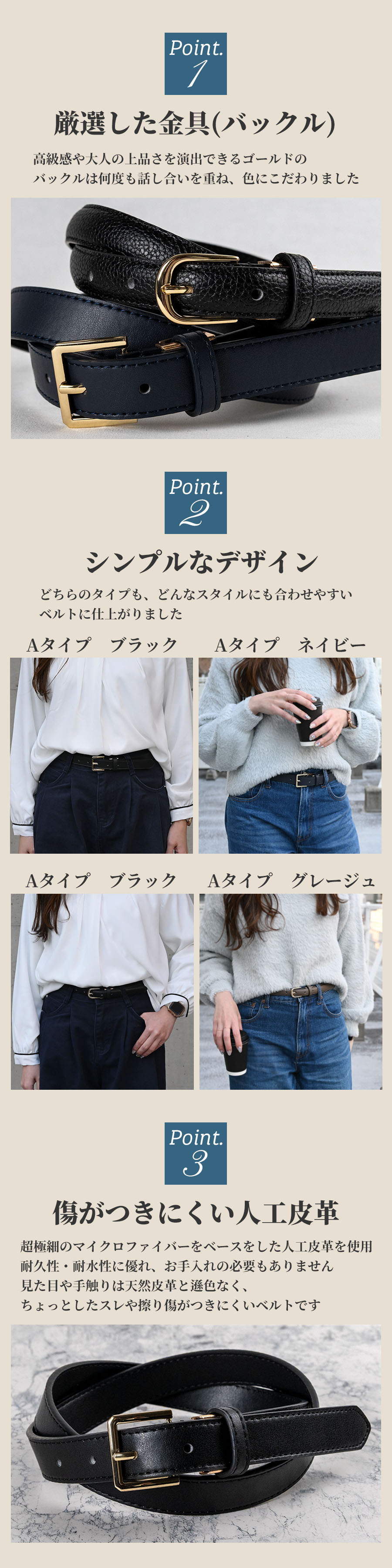 上品な輝きのゴールドバックルが、コーディネートに高級感をプラスするレディースベルト。