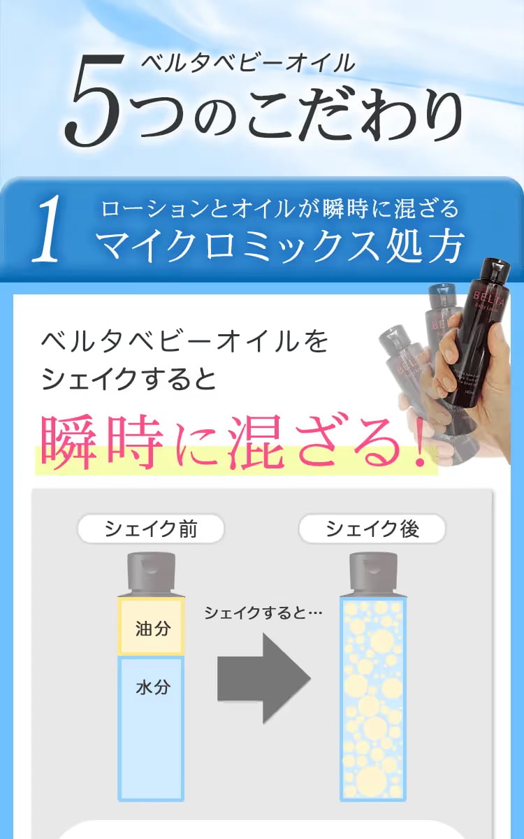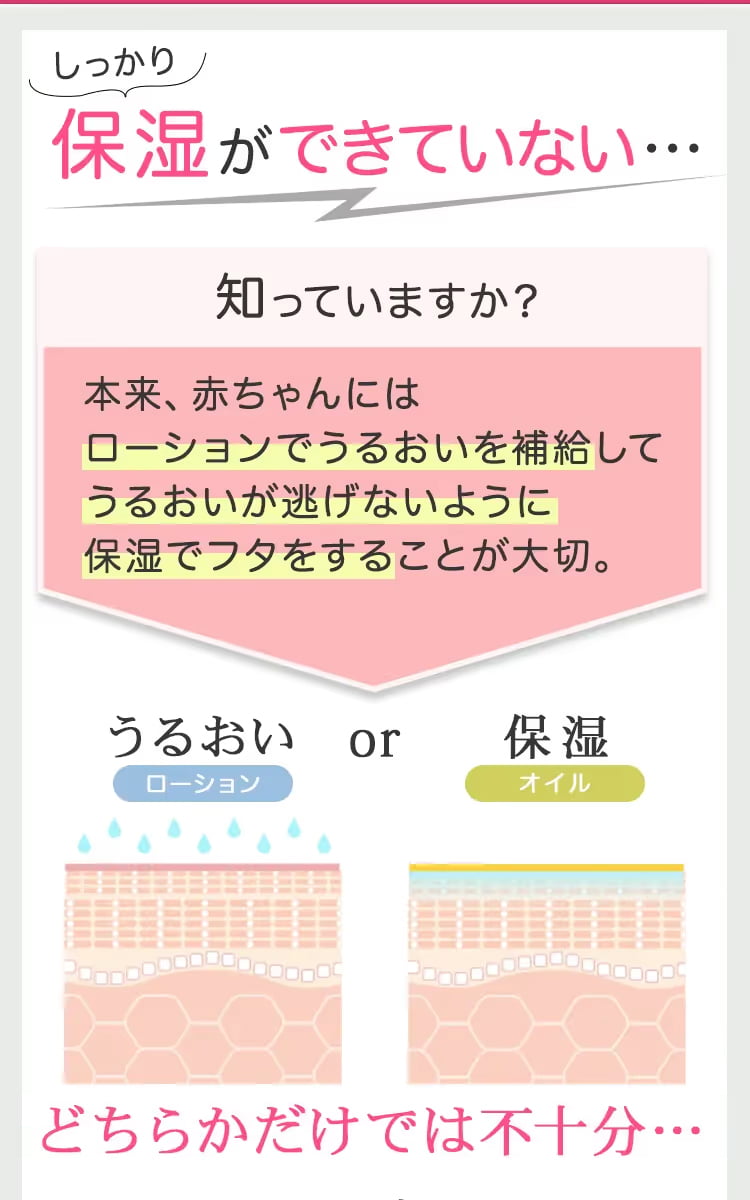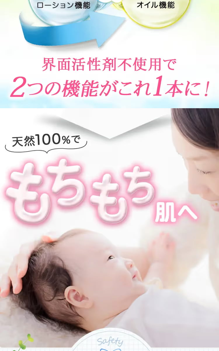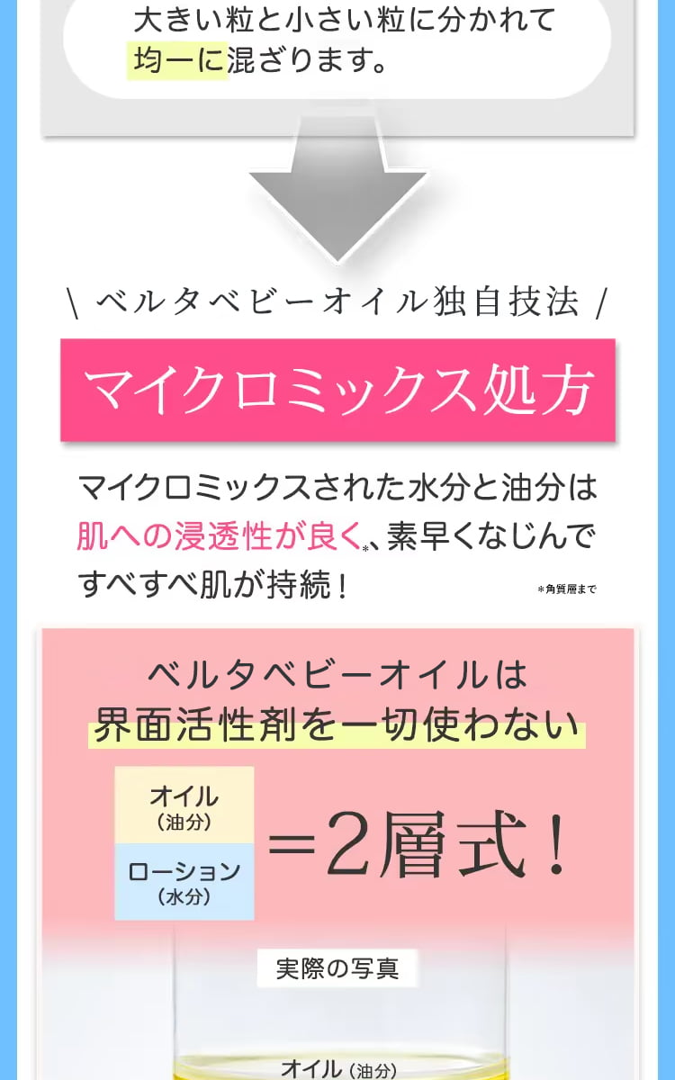 オイルとローションを2層式のためこれ1本で保湿までできます。皮膚が大人の肌の1/2しかない赤ちゃんにとっても、水分と油分は肌への浸透性※は良く、素早く馴染むのですべすべ肌が持続します。 ※角質層まで