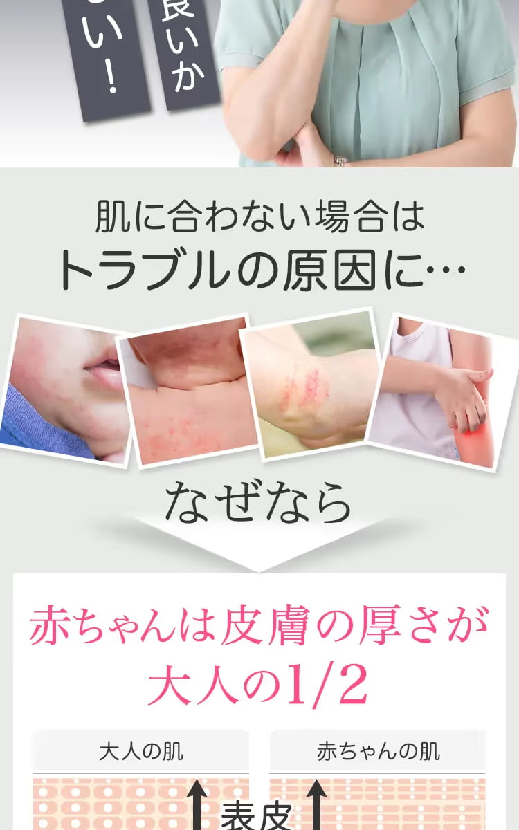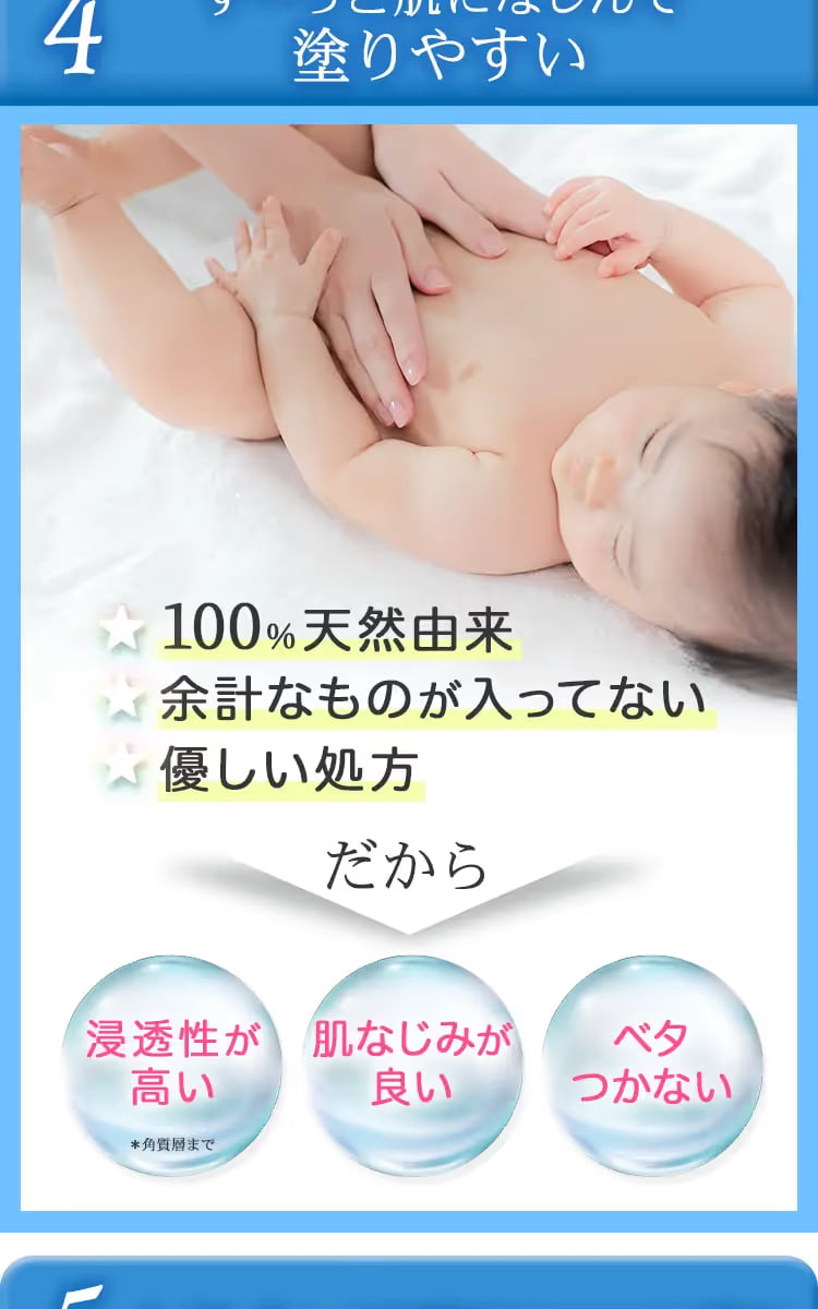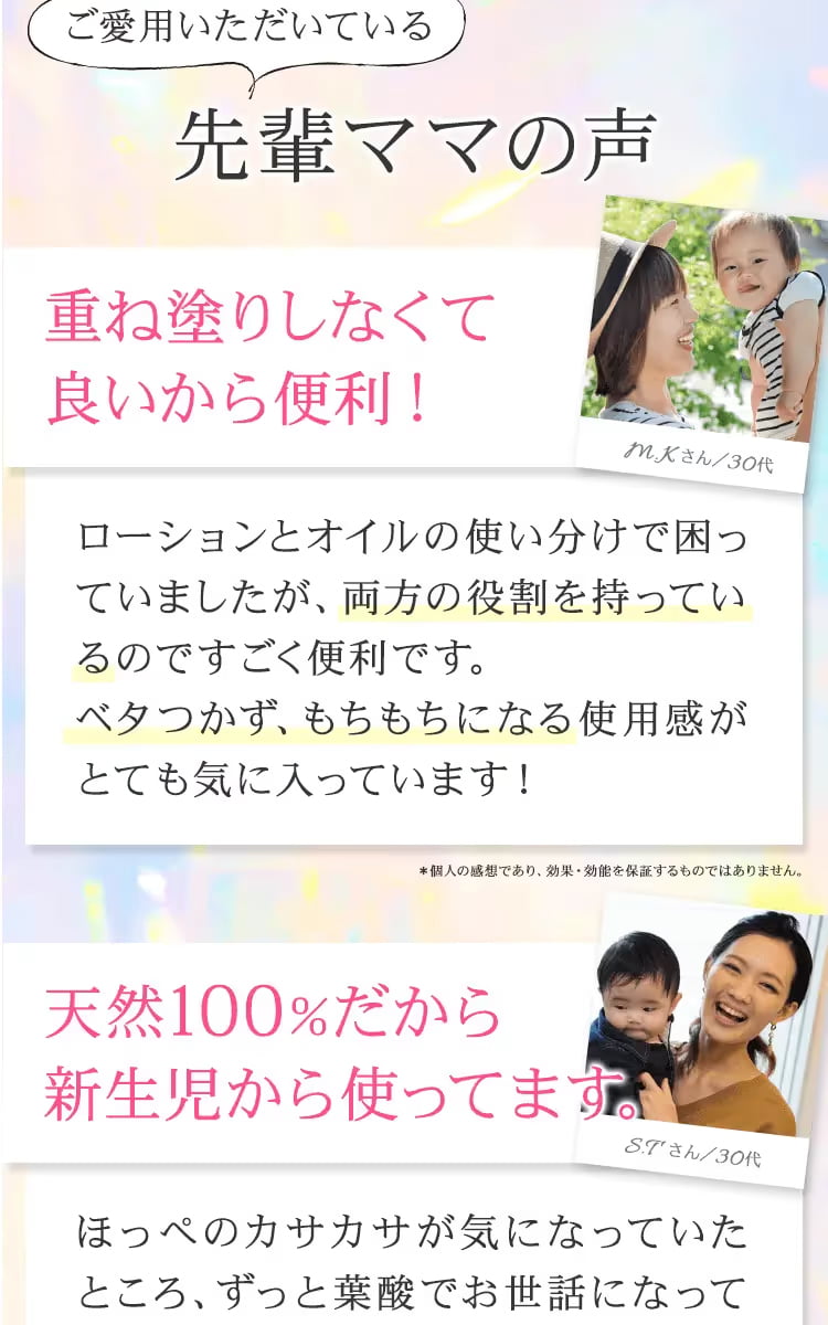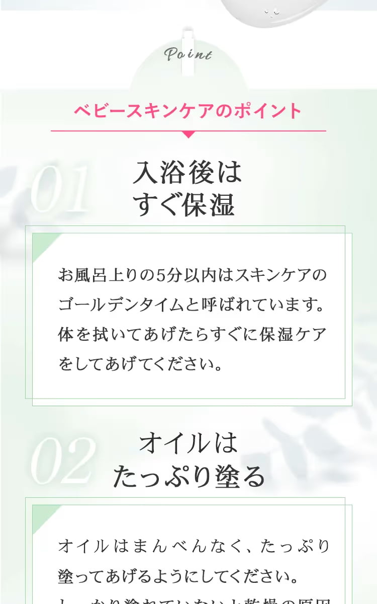 オイルとローションを2層式のためこれ1本で保湿までできます。皮膚が大人の肌の1/2しかない赤ちゃんにとっても、水分と油分は肌への浸透性※は良く、素早く馴染むのですべすべ肌が持続します。 ※角質層まで