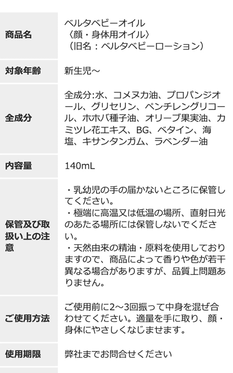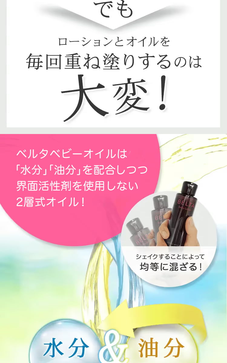 『ベルタベビーオイル』は赤ちゃんの肌への負担を本気で考えたオイルインローションです。