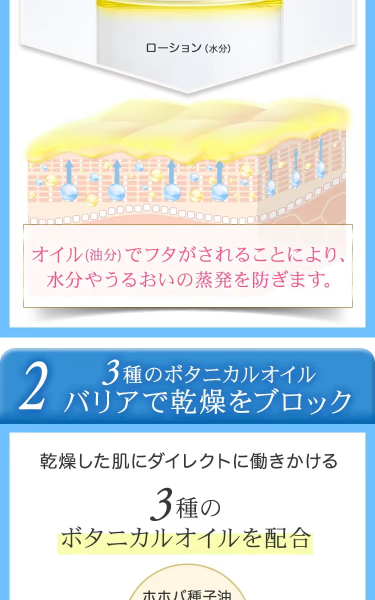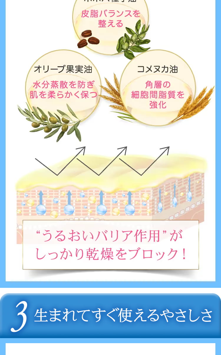 3大有効成分、コメヌカ油、オリーブ果実油、ホホバ種子油の3種のボタニカルオイル配合しいるため、潤いバリアで乾燥肌にダイレクトにはたらきかけます。