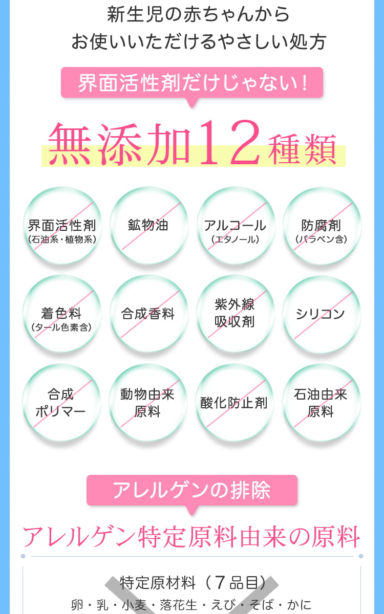 界面活性剤不使用だけでなく、新生児の赤ちゃんからお使いいただける優しい処方になっています。