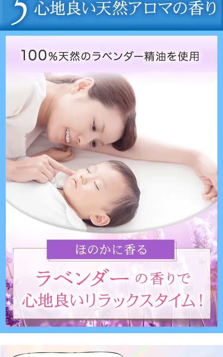 100%天然のラベンダー精油を使用したほのかに香るやさしい香り。ラベンダーの香りで心地良いリラックスタイムをお過ごしいただけます。