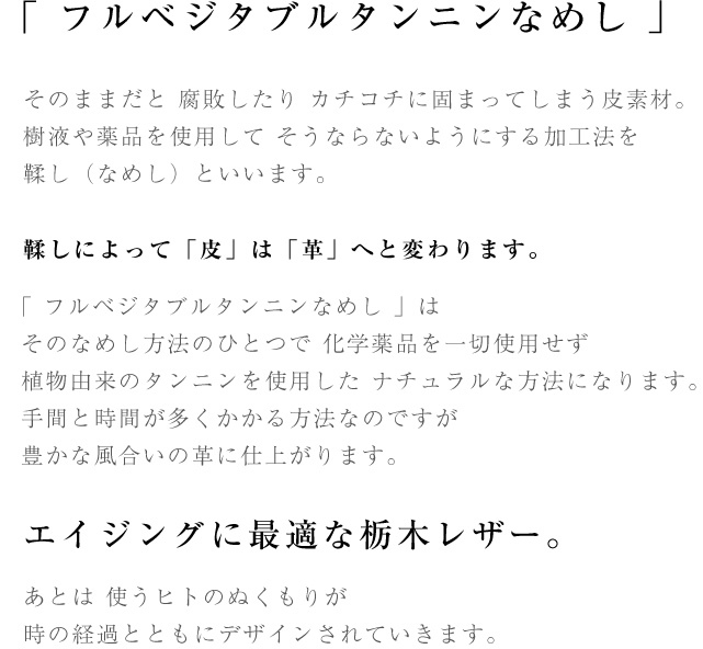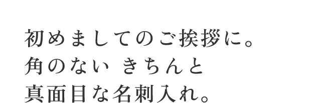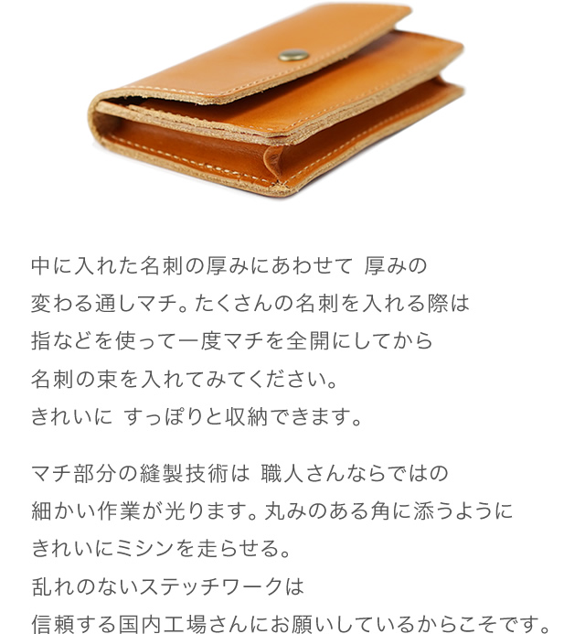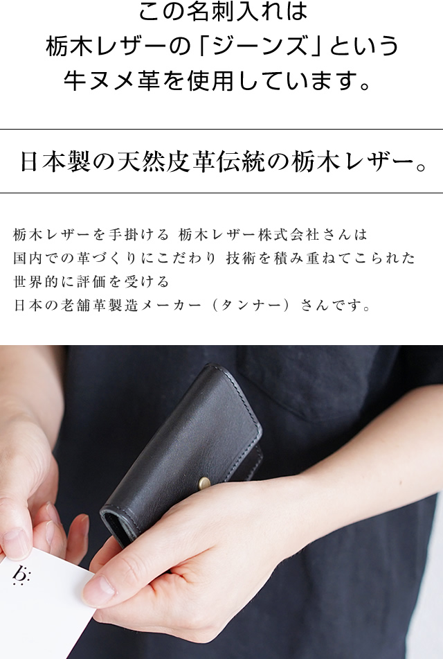 | 初めて会う方へのご挨拶のとき 必ず携えていくのが名刺入れ。真摯な気持ちや誠実な態度を表しつつ 堅苦しい感じがしない。そんな理想を目指して企画された名刺入れです。 全体としては きちんと感のある 四角いシルエット。少し肩の力の抜けた雰囲気になるよう 角にはちょっとした丸みをもたせました。ナチュラルな風合いが楽しい 栃木レザーさんの【 JEANS ジーンズ 】を贅沢に使って国内の工場で 丁寧にハンドメイドで作っていただきました。 厚みもしっかりと こだわりの「フルベジタブルタンニンレザー」で作った名刺入れだからこそご愛用いただくうちに 少しずつ味わい深くなっていく 経年変化(エイジング)も 存分にお楽しみいただけます。 変わりゆく名刺入れを通して 職場での成長に思いをはせる。なんていうのも 長くご愛用いただく間の楽しみだと思います。 |
