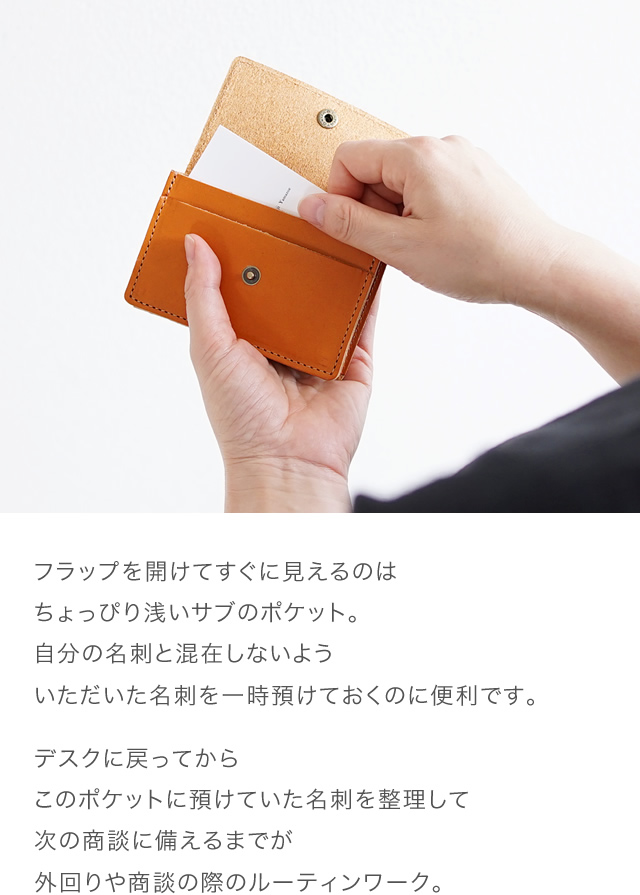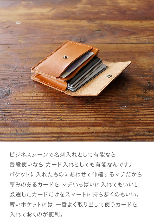 | ●商品番号 BL-NW-0060 ● 日本製 ● カテゴリー 名刺入れ ・ カードケース ● 素材 ・牛革 フルベジタブルタンニングレザー ● サイズ ・タテ 約7.0cm × ヨコ 約10.5cm × アツサ 約2.0cm ・開いた時のタテ 約13.0cm ・重さ:約40g |