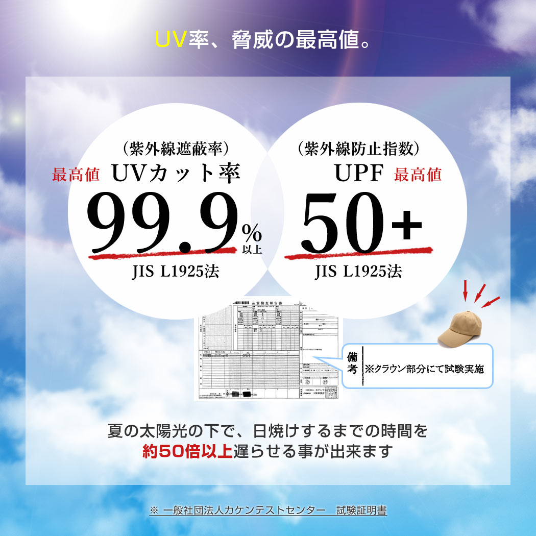 UVカット99.9%以上、UPF50+。(紫外線量50分の1以下、業界最高値)日本国内で品質検査済。