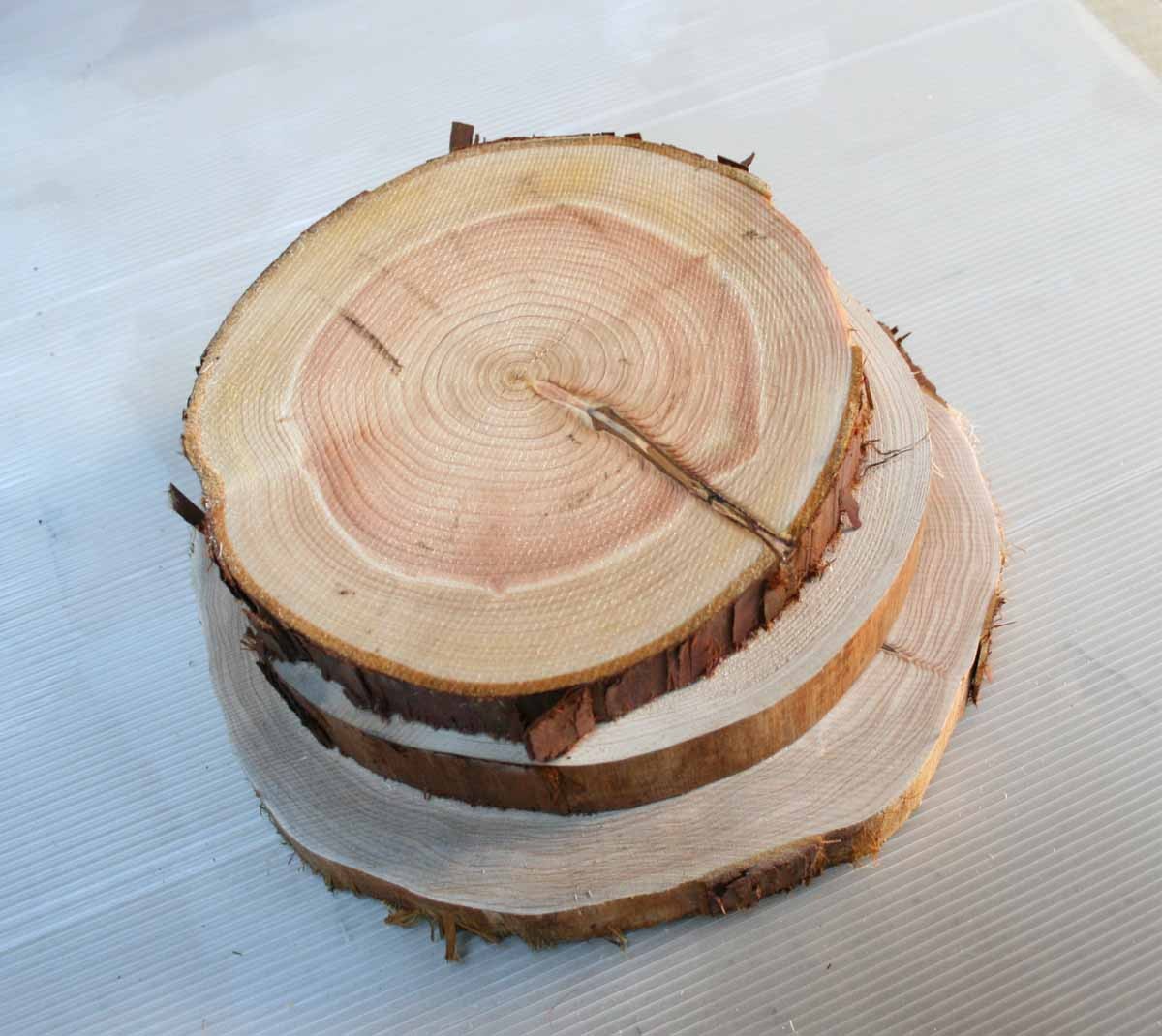 ミニサイズがかわいい丸太の輪切りです。写真のようにディスプレイしたり、