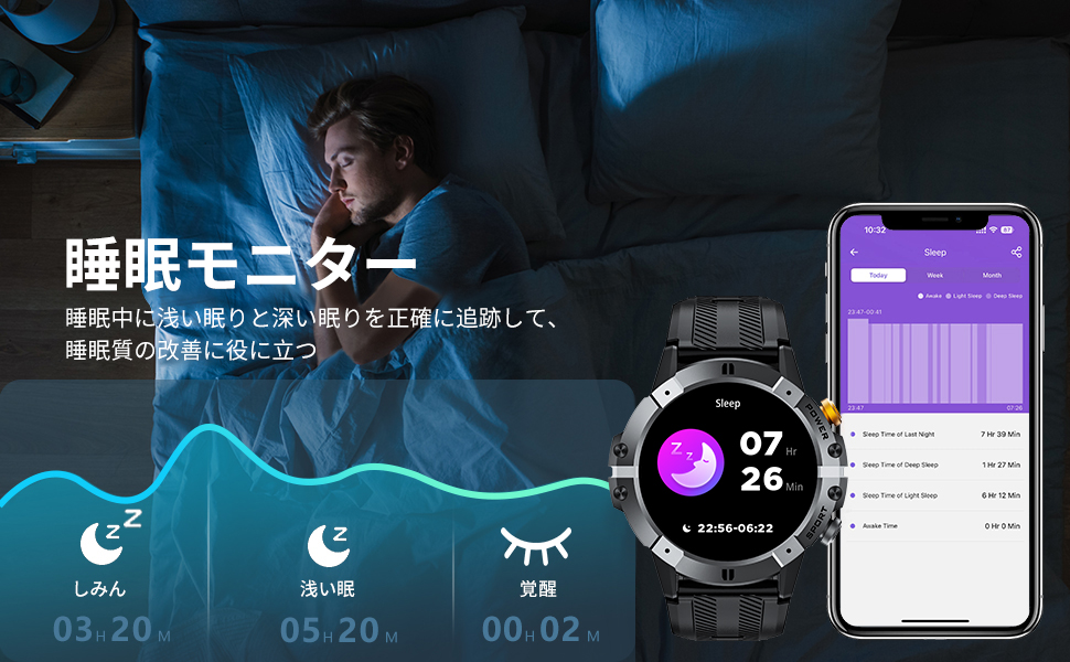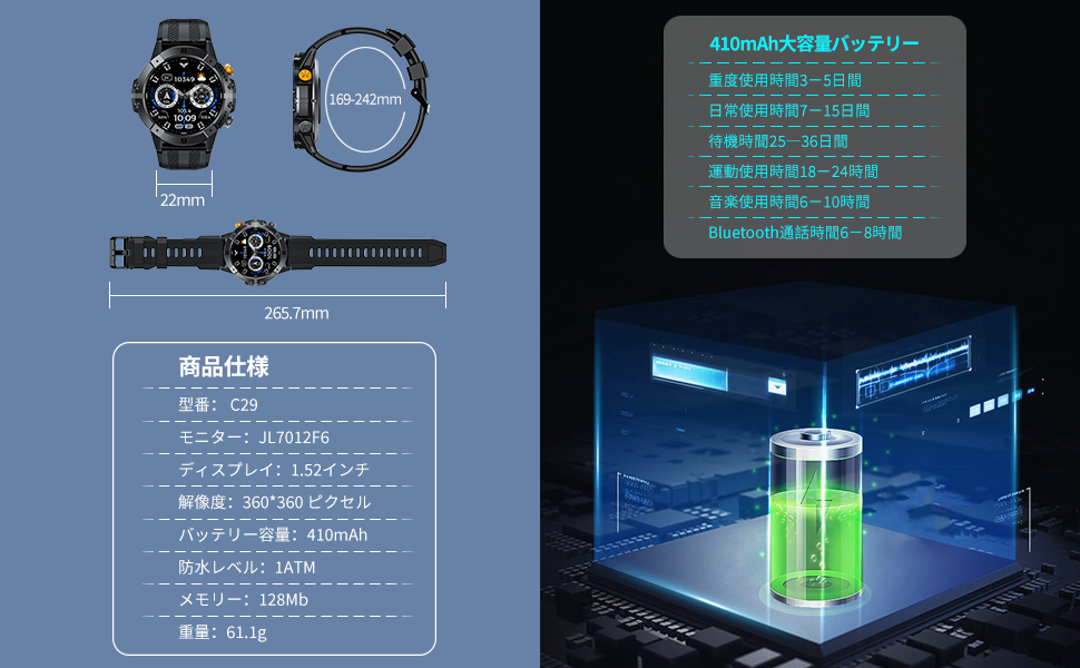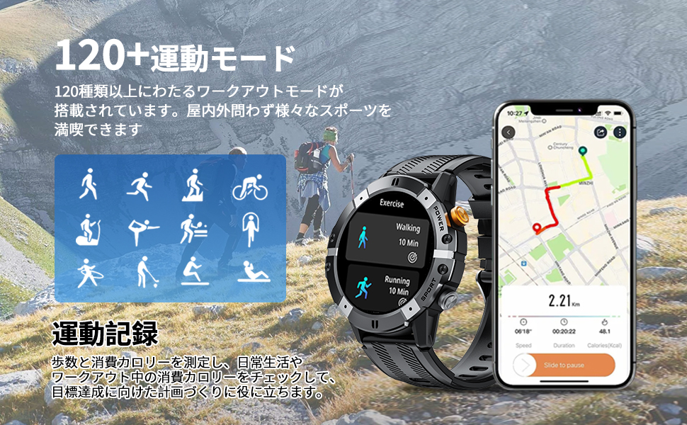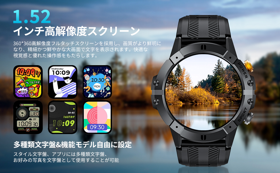 【軍用規格スマートウォッチ&1.52インチ大画面】弊社のスマートウォッチは特殊な複合材料を採用され、耐低温-40℃、耐高温60℃、耐衝撃、防水防塵など、多くの軍用標準テストに合格することができます。スポーツウォッチは、間違いなく野外活動のようなときにあなたの信頼できる仲間になることができます。Smart watchの画面は耐衝撃性のガラスが採用するため、耐久性と傷がつきにくくなっています。1.52インチ高解像度スクリーン360*360高解像度フルタッチスクリーンを採用し、画質がより鮮明になり、精細かつ鮮やかな大画面で文字を表示されます。快適な視覚感と優れた操作感をもたらします。