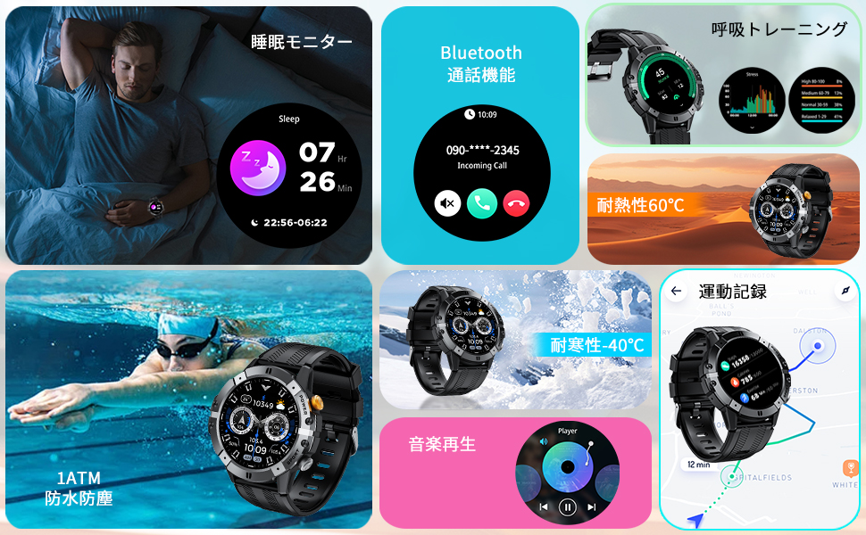 【うれしい機能が満載&最適プレゼント】専用アプリに合わせて使えば、このアウトドアスポーツウォッチが持つ様々な便利な生活機能を享受できます。着信通知/拒否/通話、輝度調整、天気予報、活動量計、歩数計、スマホ探し、バイブレーション強度調整、目覚まし時計、カメラ制御、音楽制御/再生など実用な機能が備えます。敬老の日、誕生日、父の日、母の日、新年 クリスマスに最高なプレゼントとなります。