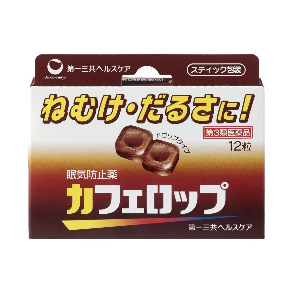 商品特徴 ねむけ・だるさに! ●無水カフェイン500mg(12粒あたり)が大脳皮質に作用して、ねむけ・だるさを除去するドロップタイプの眠気防止剤です。 ●2粒中に、コーヒー約1杯分に相当するカフェインを含有しています。 ●携帯に便利なスティック包装です。 効能・効果 睡気(ねむけ)・倦怠感の除去 用法・用量 ・成人(15歳以上)の場合、1回あたり4粒を1日3回、1粒ずつを口中で噛み砕くか、または口中で溶かして服用して下さい。 ・15歳未満は服用しないで下さい。 ★用法・用量に関連する注意 ・用法・用量を厳守して下さい。 ・服用間隔は4時間以上として下さい。 成分 (1日量(12粒)中) 無水カフェイン・・・500mg 添加物:ショ糖脂肪酸エステル、カカオ、白糖、水アメ、香料、エタノール、エチルバニリン、バニリン、プロピレングリコール