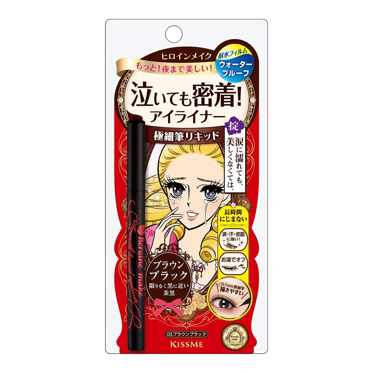特徴: ●新処方のスーパーキープポリマー配合で、涙・水・皮脂を徹底的にガードし、にじみやはがれに強く目頭から目尻まできれいなラインを長時間キープします。 ●誰でも描きやすい!0.1mmの極細筆。細いラインも目尻のハネも簡単に出来ます。 ●目元を保湿する4種類の美容液成分配合 ●にじまないのにお湯でオフ ●染料不使用で肌に色素が残らない ●限りなく黒に近いブラウンブラック 内容量:0.4mL 使用方法: (1)まつ毛の際にそって、目頭から目尻まで細くラインを描きます。 (2)まぶたのカーブの延長線にそって目尻にラインを描き足します。 ※ご使用の際は、キャップをしめたまま2〜3回軽く振ってください。 ※初めてお使いになる場合や、色が薄くなって描きづらくなった場合は、キャップをしめたまま2〜3回軽く振って下向きで数分放置し、ティッシュ等でペン先をなじませてからお使いください。 ※使用後は、筆先に付いた汚れをきれいにふきとり、キャップをきちんとしめてください。