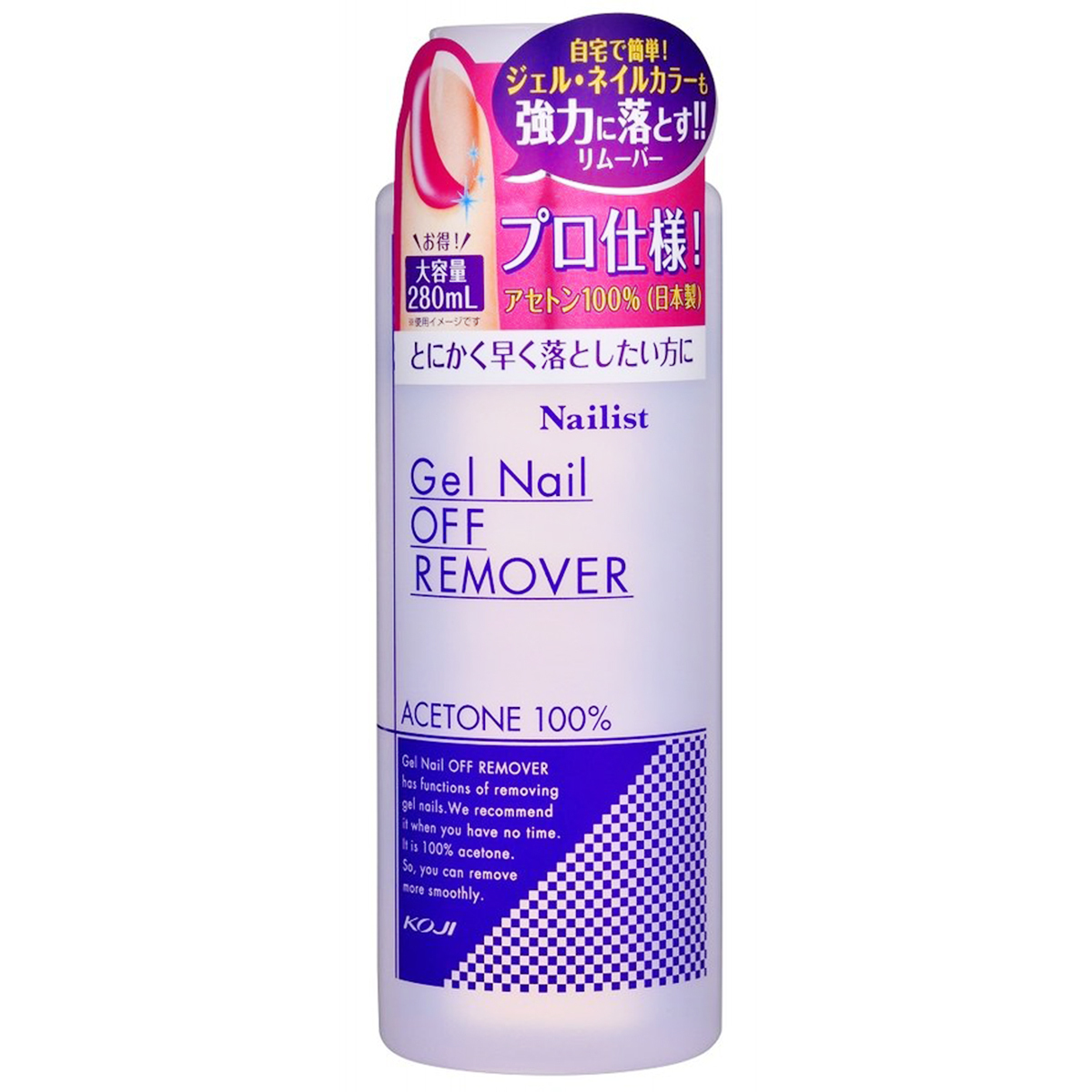特徴 ●自宅で簡単にサロンレベルのジェルネイルオフができる、除去力に特化したジェルネイルリムーバーです。 ●アセトン100% で強力除去! 落とすのに時間がかかるジェルネイルも、プロ仕様のアセトン100%リムーバーなら、簡単・スピーディーにオフすることができます。 ●無香料・無着色 香料や着色などの添加成分を加えるとアセトンの配合率が下がり、除去力もダウン。除去力を最大限に引き出すため余分な添加剤を一切含みません。 ●大容量280ml入り 成分 アセトン