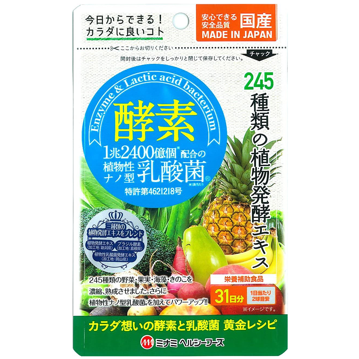 特徴 ●カラダ想いの酵素と乳酸菌黄金レシピ ●245種類の野菜・果実・海藻・きのこを濃縮、熟成させました。さらに植物性ナノ型乳酸菌を加えてパワーアップ!! ●1兆2400億コ配合の植物性ナノ型乳酸菌(1袋当たり) ナノ型乳酸菌は長野県木曽地方で400年以上の食歴のある「すんき漬け」に含まれる乳酸菌です。ナノ型乳酸菌は、(有)バイオ研の登録商標です。 ●三種類の植物発酵エキスをブレンド ・植物発酵エキス(加工地:新潟県) ・ブラジル酵素(加工地:島根県) ・植物性乳酸菌発酵エキス(加工地:岡山県) ●毎日の美容、健康維持に! お召し上がり方 栄養補助食品として、1日当たり2球程度を目安にそのまま水またはぬるま湯と一緒にお召し上がりください。 原材料 サフラワー油、ゼラチン、植物発酵エキス(デキストリン、甜菜糖、黒砂糖、麦芽糖、よもぎ、ウコン、その他)、乳酸菌、グリセリン、ミツロウ、グリセリン脂肪酸エステル、(原材料の一部にりんご、大豆、やまいも、バナナ、ごま、オレンジ、カシューナッツ、キウイフルーツ、ももを含む)