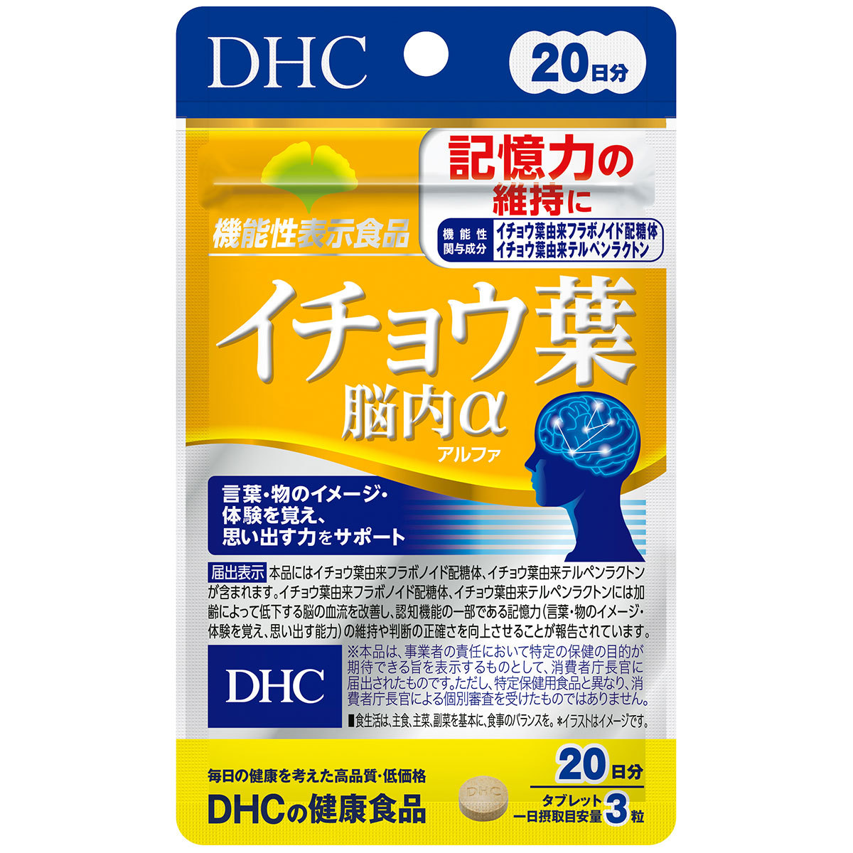 特徴 ●機能性関与成分(イチョウ葉由来フラボノイド配糖体)を1日摂取目安量あたり43.2mg、(イチョウ葉由来テルペンラクトン)を1日摂取目安量あたり10.8mg配合した機能性表示食品です。 ●イチョウ葉由来フラボノイド配糖体、イチョウ葉由来テルペンラクトンは、加齢によって低下する脳の血流を改善し、認知機能の一部である記憶力の維持や、判断の正確さの向上に役立つことが報告されています。「昨日の夕食が思い出せない・・・」「あの人の名前、なんだったっけ・・・」など、言葉や物のイメージ・体験を覚え、思い出す能力に不安を感じ始めた方の記憶力や判断力の維持をサポートします。 ●機能性表示食品(届出番号:C32) 【保健機能食品表示】 イチョウ葉由来フラボノイド配糖体、イチョウ葉由来テルペンラクトンには加齢によって低下する脳の血流を改善し、認知機能の一部である記憶力(言葉・物のイメージ・体験を覚え、思い出す能力)の維持や判断の正確さを向上させることが報告されています。 お召し上がり方 ・1日3粒を目安にお召し上がり下さい。 ・1日摂取目安量を守り、水またはぬるま湯で噛まずにそのままお召し上がりください。