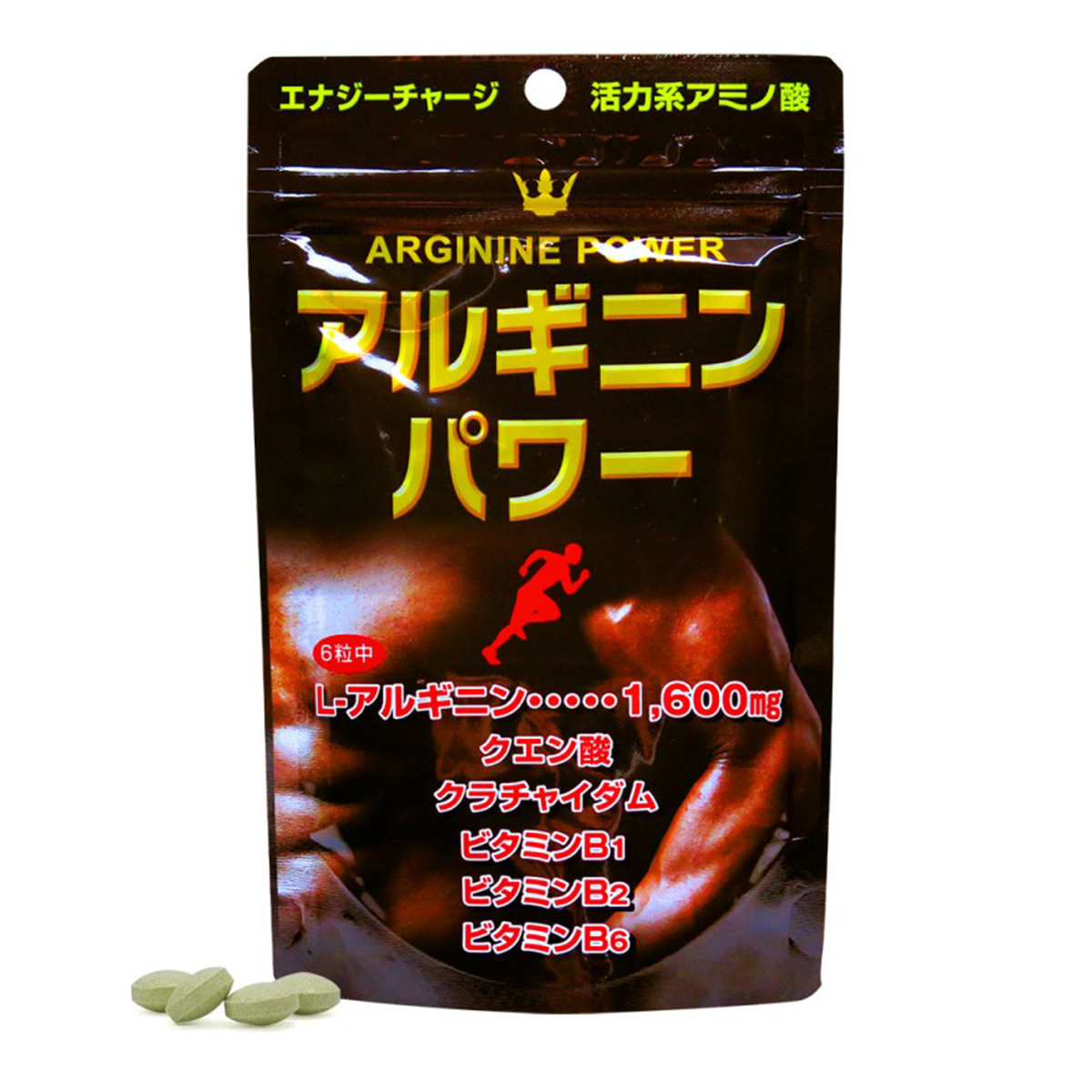 特徴 〜スポーツ時やトレーニングにアルギニンパワー〜 本品は、スポーツ時やトレーニングの際に役立つアミノ酸の一種・L-アルギニンを中心に、タイ原産のショウガ科の植物 黒ショウガ(クラチャイダム)、クエン酸、ビタミンB1、ビタミンB2、ビタミンB6を配合した健康補助食品です。目標に向かって 励む方、ハードな毎日を過ごす方にお勧めです。 お召し上がり方 ●健康補助食品として一日4〜6粒を目安に2〜3回に分け、水等と共にお召し上がりください。 ●空腹時及び一度に大量のお召し上がりはお控えください。 ●最初は少量よりお召し上がりください。 原材料 黒ショウガ末、微粒二酸化ケイ素、L-アルギニン、HPC、セルロース、ビタミンB1、クエン酸、ビタミンB2、ステアリン酸カルシウム、ビタミンB6