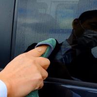 (1) 水洗いでガラス表面の汚れ(砂埃等)を除去し水滴を拭き上げ。