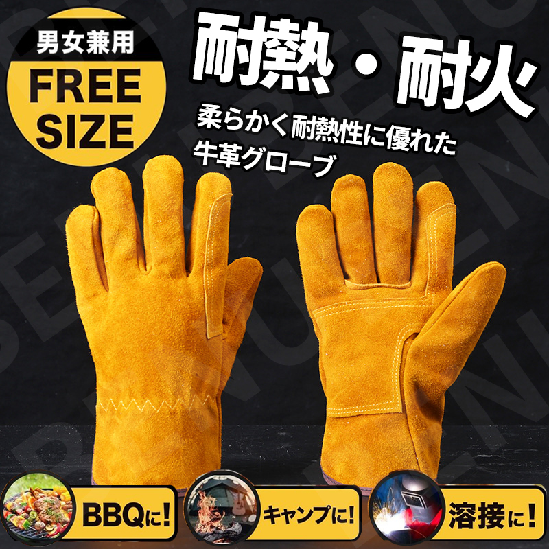 耐熱グローブ キャンプ 耐熱 グローブ 耐火 手袋 軍手 アウトドア バーベキュー 鍋つかみ 焚き火 作業用 牛皮 フリーサイズ BBQ