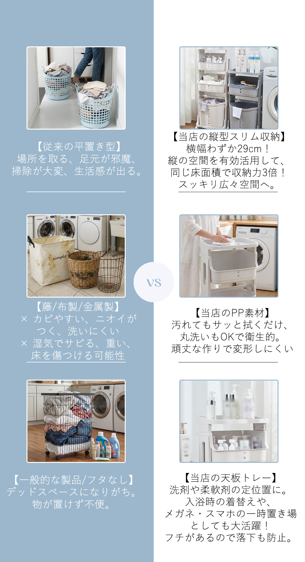| ●商品ポイント | 【ランドリーワゴン多層設計】 収納ラック3 層に分かれており、各層に異なる種類のものを別々に入れることができます。トイレタリーやタオルは上部のバスケットに入れ、汚れた衣類はランドリー バスケットに入れることで、バスルームのスペースをより有効に活用できます。 【キャスター付き】 4 つの 360° 回転ホイールを備えたランドリー バスケットにより簡単に押して移動でき、脱衣所、バスルーム、リビングルームなど、どこに行っても洗濯物を簡単に集めることができます。 【取り外し可能なランドリーバスケット】 下部の汚れた洗濯バスケットは取り外して別々に使用できるように設計されており、単独で使用する場合は持ち運びに便利な手すりが付いており。洗濯機から離れていても脱いだ服を入れたまま持ち運べます。 【隙間収納】 脱衣所 ラック奥行きはわずか29cm,縦方向で隙間収納としても使えます。コンパクトでお風呂場を広く使える。狭いスペースでも収納機能を最大限に活用できます。 |