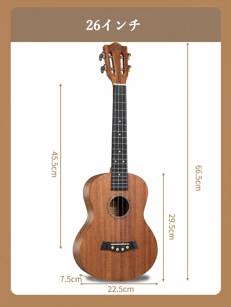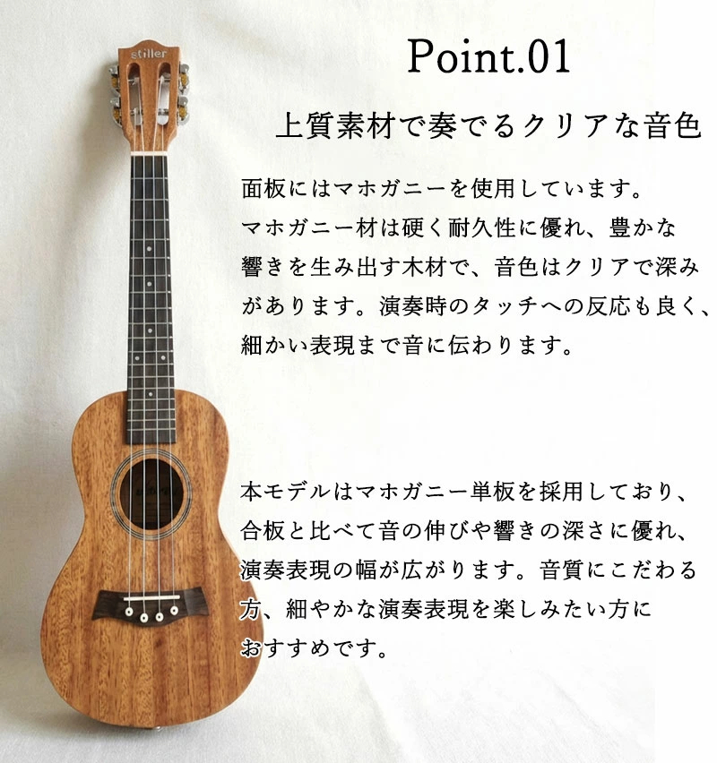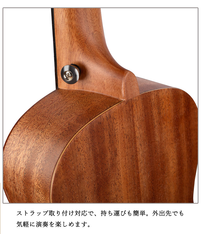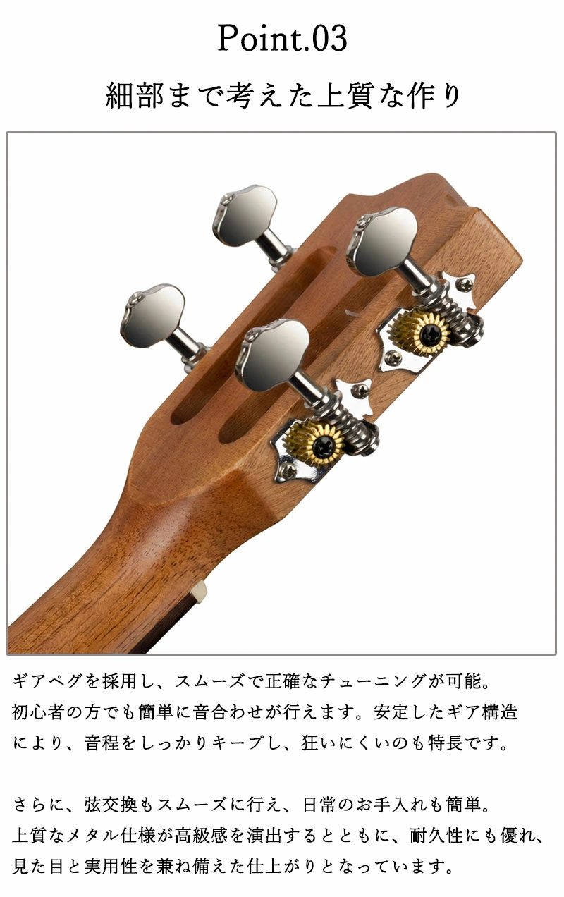 ギアペグを採用し、スムーズで正確なチューニングが可能。 初心者の方でも簡単に音合わせが行えます。 安定したギア構造により、音程をしっかりキープし、狂いにくいのも特長です。 さらに、弦交換もスムーズに行え、日常のお手入れも簡単。 上質なメタル仕様が高級感を演出するとともに、耐久性にも優れ、 見た目と実用性を兼ね備えた仕上がりとなっています。
