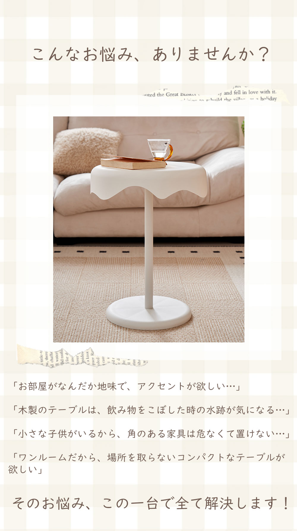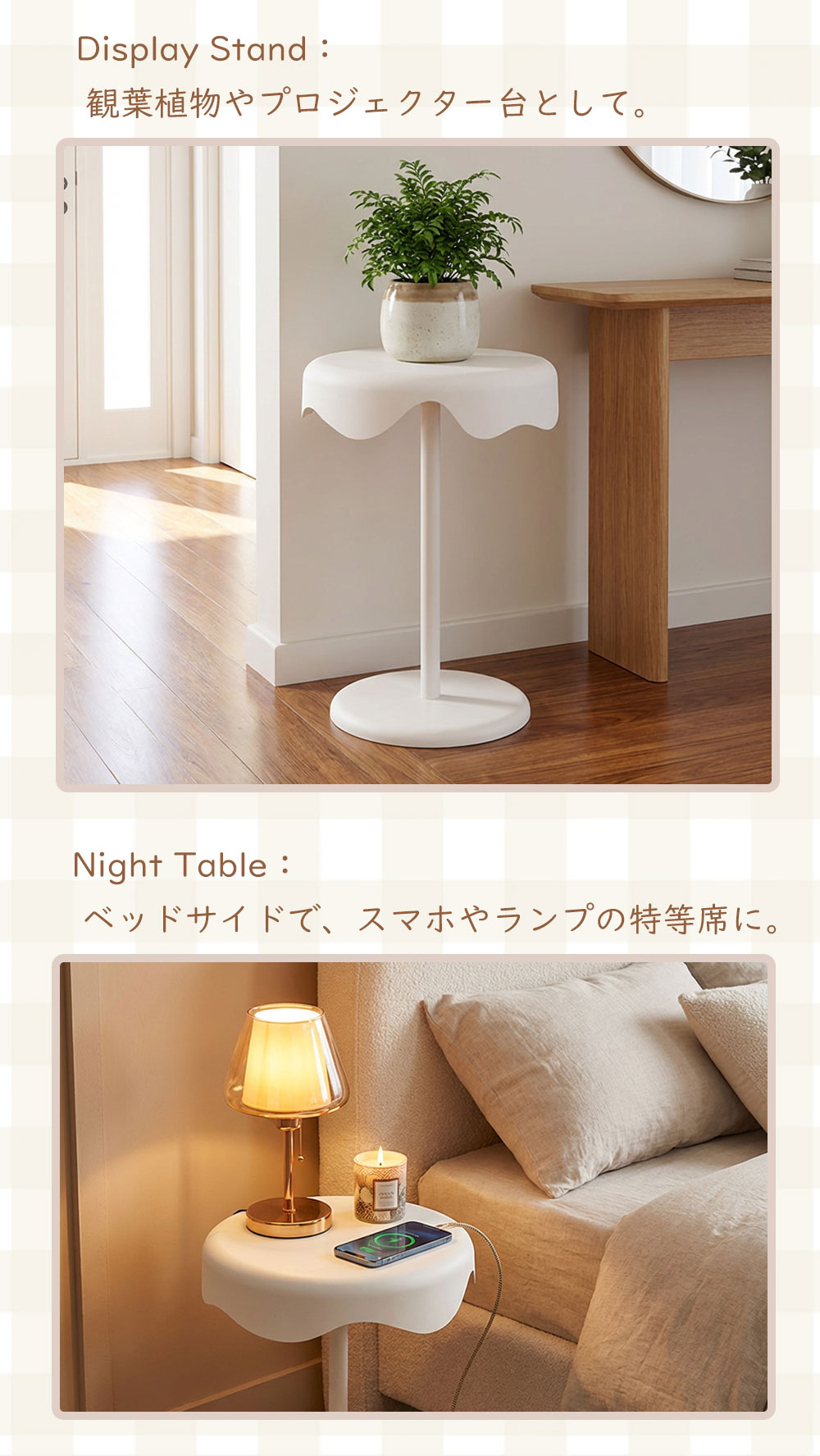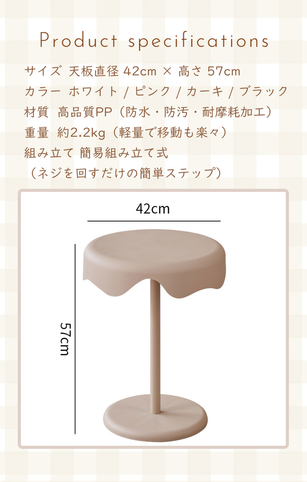 | ●商品ポイント | 1. 【新素材】水や汚れに強い!お手入れもラクラク 高品質なPP素材を採用。木製テーブルと違い、飲み物をこぼしても染み込む心配がありません。 防水性: 結露したグラスを置いても輪染みができず、サッと拭くだけ。 防汚性: 汚れがつきにくく、汚れても中性洗剤で簡単にお掃除可能。 キッチン周りや、観葉植物を置くディスプレイ台としても最適です。 2. 曲線が美しい「ウェーブデザイン」 天板の縁が波打つようなデザインは、見た目に優しいだけでなく、お部屋のアクセントに。 マットで高級感のある質感が、北欧スタイルやモダンなインテリアに自然に馴染みます。 3. 角のない「丸み設計」で安心・安全 天板からベースまで角を削ぎ落としたラウンドデザイン。 小さなお子様やペットがいるご家庭でも、ぶつかって怪我をする心配が少なく、安心してお使いいただけます。 4. 抜群の安定感&しっかり固定 幅広ベース: 底面を広く設計することで、重心が安定し倒れにくい構造です。 高品質金具: 支柱と天板は金属プレートでしっかり固定。長く使ってもガタつきにくい仕様です。 活用シーンは無限大 ソファサイド: 57cmの絶妙な高さで、座ったまま飲み物に手が届きます。 ベッドサイド: スマホ、メガネ、ナイトランプを置くナイトテーブルに。 玄関・廊下: 防水仕様なので、アルコール消毒液や鍵置き場としても便利。 |