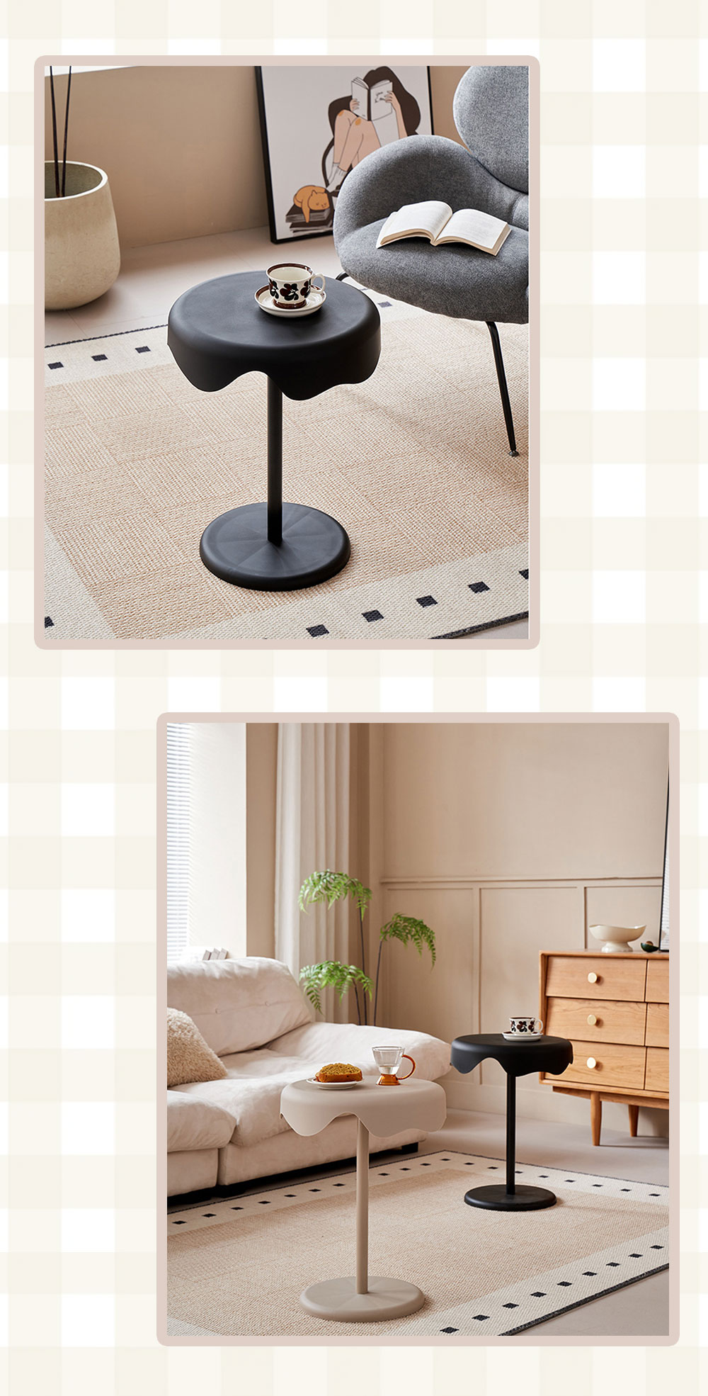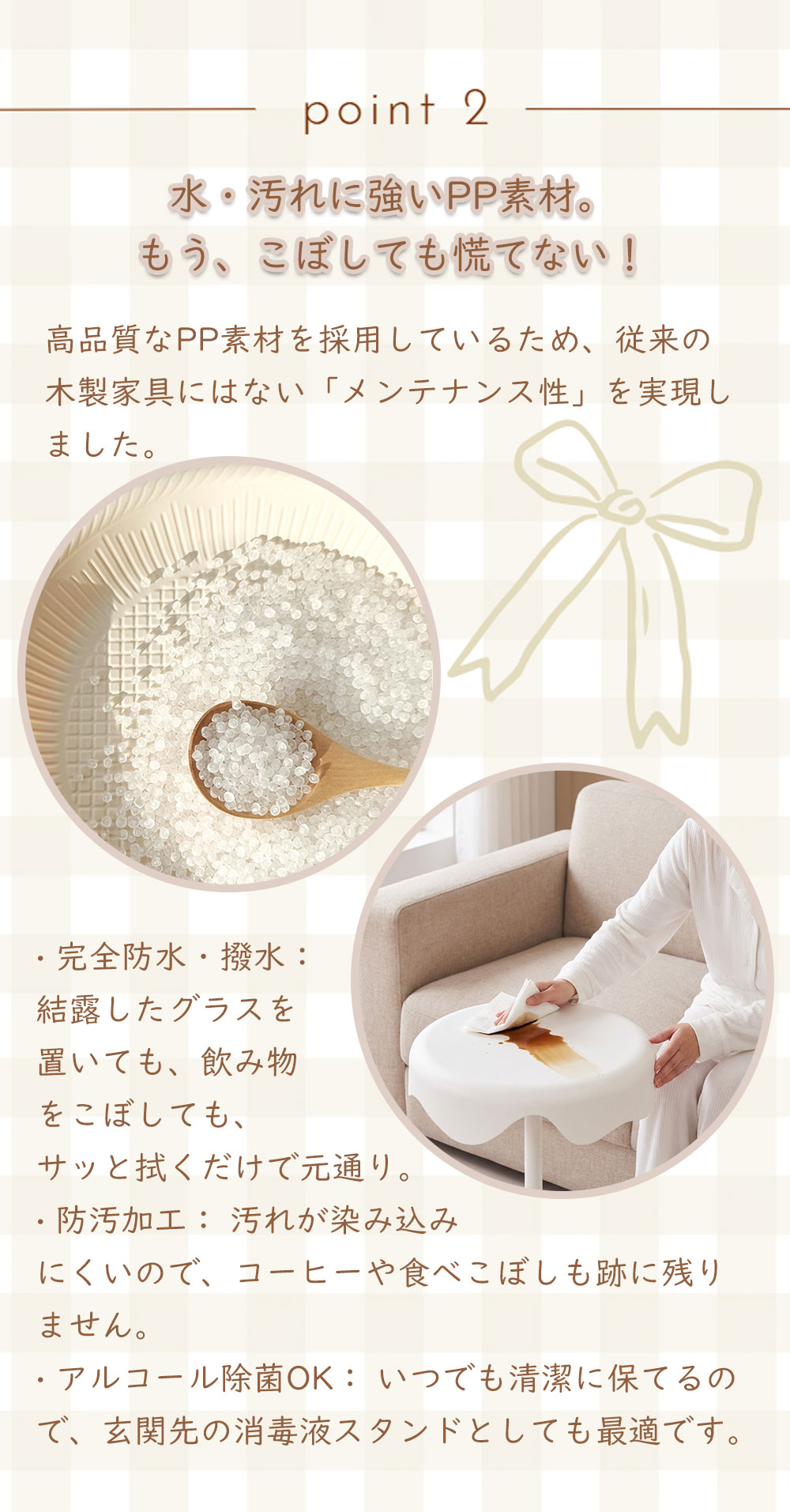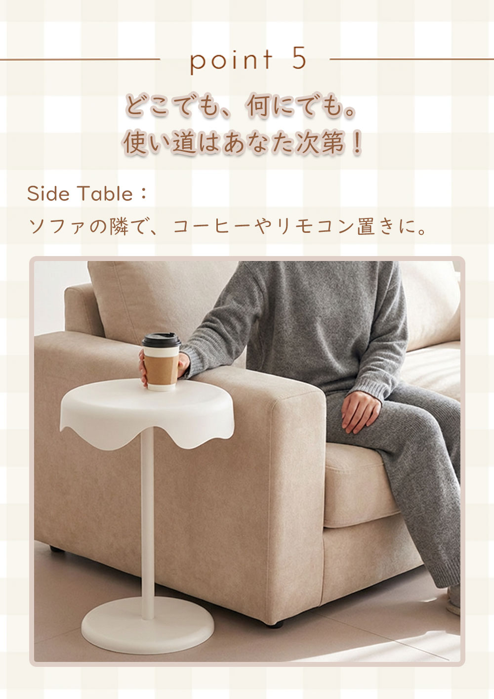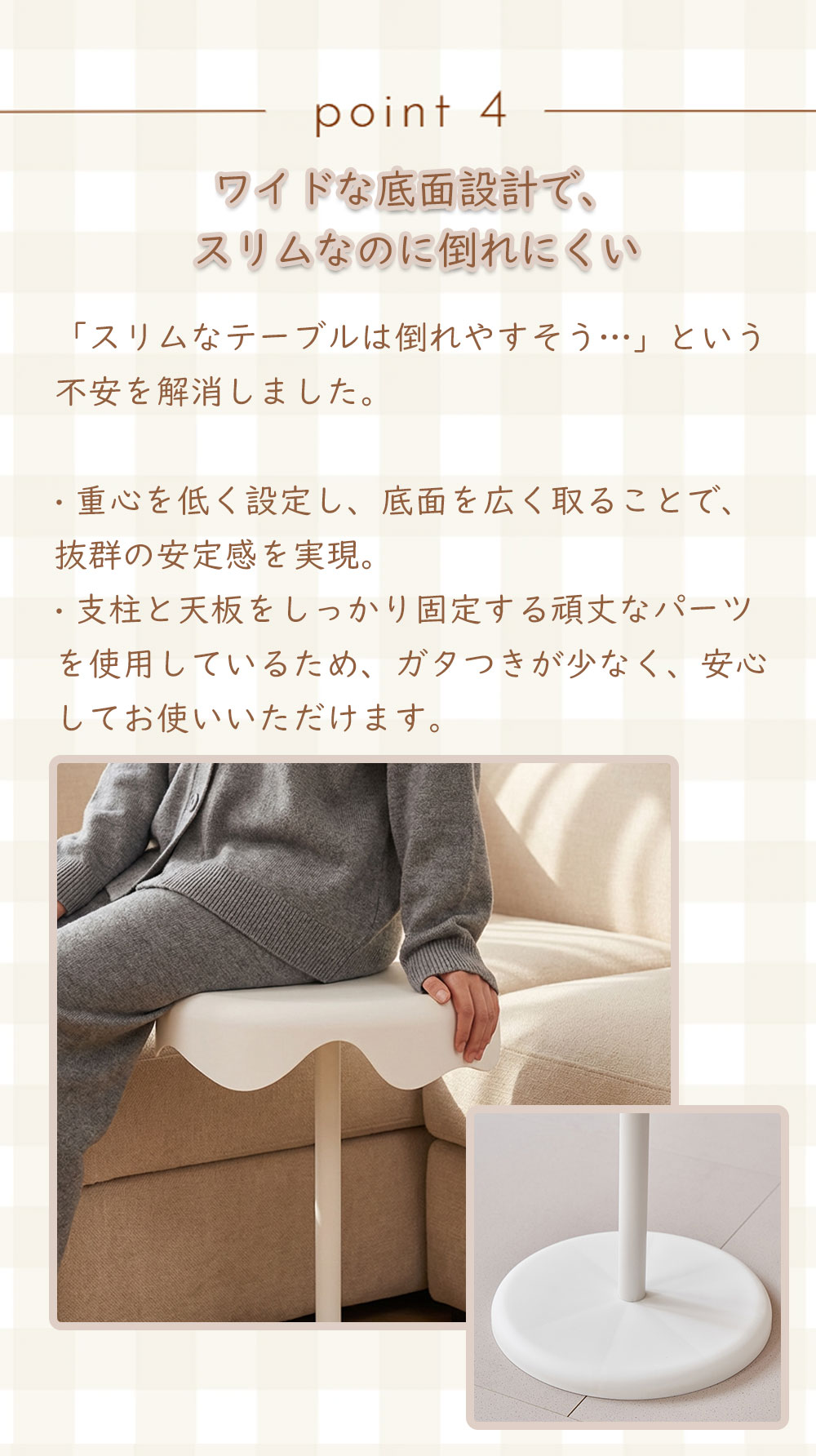 | ●商品ポイント | 1. 【新素材】水や汚れに強い!お手入れもラクラク 高品質なPP素材を採用。木製テーブルと違い、飲み物をこぼしても染み込む心配がありません。 防水性: 結露したグラスを置いても輪染みができず、サッと拭くだけ。 防汚性: 汚れがつきにくく、汚れても中性洗剤で簡単にお掃除可能。 キッチン周りや、観葉植物を置くディスプレイ台としても最適です。 2. 曲線が美しい「ウェーブデザイン」 天板の縁が波打つようなデザインは、見た目に優しいだけでなく、お部屋のアクセントに。 マットで高級感のある質感が、北欧スタイルやモダンなインテリアに自然に馴染みます。 3. 角のない「丸み設計」で安心・安全 天板からベースまで角を削ぎ落としたラウンドデザイン。 小さなお子様やペットがいるご家庭でも、ぶつかって怪我をする心配が少なく、安心してお使いいただけます。 4. 抜群の安定感&しっかり固定 幅広ベース: 底面を広く設計することで、重心が安定し倒れにくい構造です。 高品質金具: 支柱と天板は金属プレートでしっかり固定。長く使ってもガタつきにくい仕様です。 活用シーンは無限大 ソファサイド: 57cmの絶妙な高さで、座ったまま飲み物に手が届きます。 ベッドサイド: スマホ、メガネ、ナイトランプを置くナイトテーブルに。 玄関・廊下: 防水仕様なので、アルコール消毒液や鍵置き場としても便利。 |