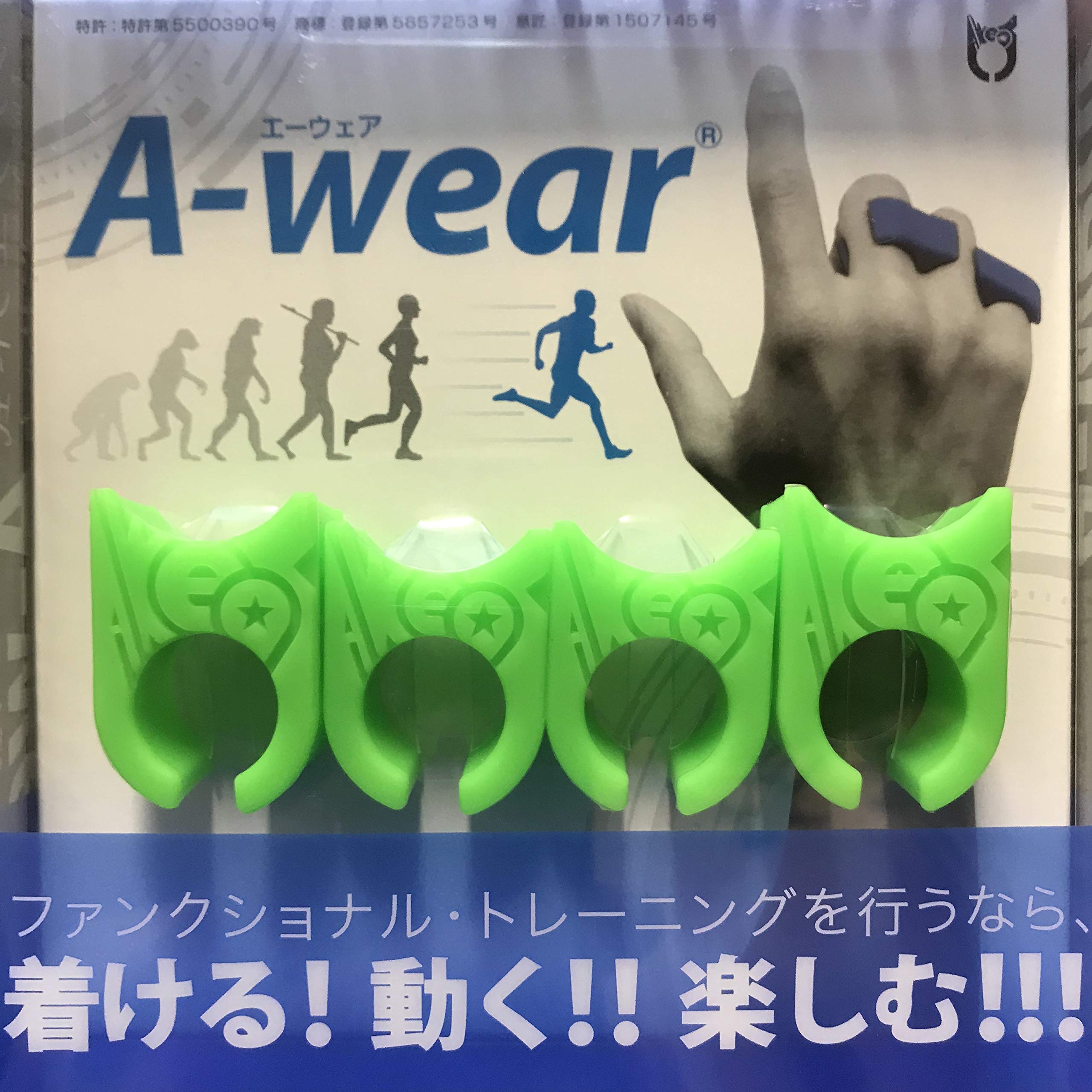 【A-wearは特許第5500390号に登録されています。】 ファンクショナルトレーニングを行う際に、装着することを目的としたツールです。 A-wearを装着すると、理想的なコンディションを維持してくれます。特にスポーツをしている方は、プレーをサポートしてくれます。 ※ 装着したままのプレーが難しい場合には、誰でも5分で出来るワークアウト「A-wear Work」をウォームアップに行った上で、A-wearを外してプレーしていただいても結構です。 また、装着しておくだけでコンディションを保つことが可能なため、パソコンに向かう時間の多いビジネスマン、体調が気になるお子さんや、お年寄りの方にも装着をお勧めしています。 こちらの商品は、他のエクササイズと比べるものでなく、全てのエクササイズをサポートするツールです。 特別な運動プログラムを行うことなく、理想的なコンディションを維持することができます。 日常の生活の至る場面(パソコンに向かうときなども)で。装着することにより。この達成が見込まれます。 また、装着状態で運動することも可能なので、スポーツ各種問わず、装着することをお勧めしています。実際に装着してから練習を行うと、どんなシュチュエーションでも実感できるとお声をいただいております。 A-wear Workとは? 身体をパーツで鍛えるのでなく、一つのまとまりとして捉えることで、自身の最大限のコンディションを引き出すことを目的とした、簡潔な、しかしながら包括的な身体メンテナンス・システムです。 手のひらで親指と人差し指のみ伸ばしたハンドポーズを取りながら、手首をひねる、腕を回す、鼠蹊部を叩く、といった簡単ないわゆる「体操」を行うことで、 「無意識的に良い状態で在り続けること」を達成し、日常生活でかかる身体への負担が、そのまま健康維持のための運動負荷となるようプログラミングされています。その最大の魅力は、人に頼ることなく、最小限の努力で自分の身体を良い状態へと調整し、その生涯を健康なまま過ごせることにあります。
