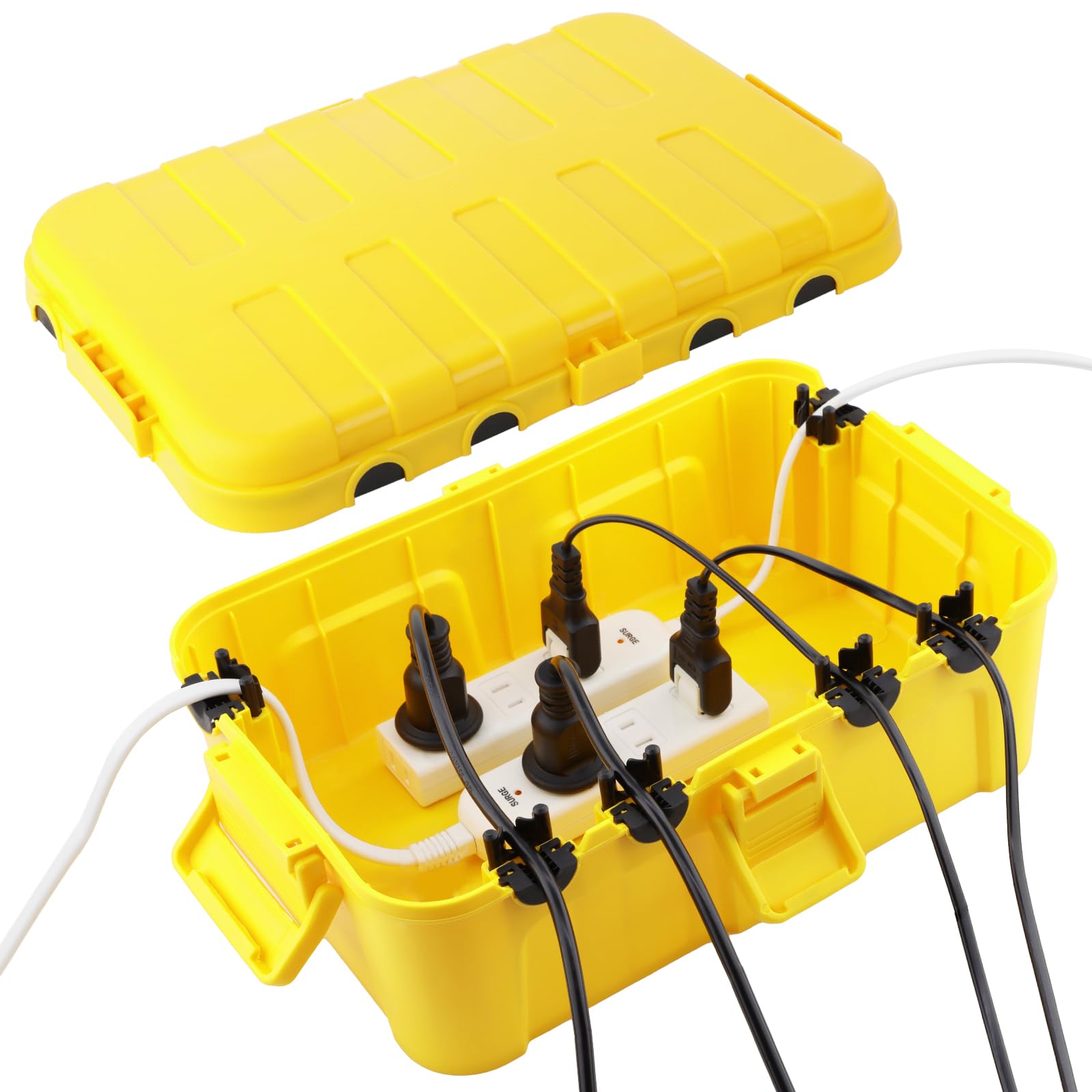 使いやすい:4つのラッチを引いたり押したりするだけで、ボックスを開閉できます。電源を接続し、クランプでコードを留めます。ボックスを壁に取り付けるには、裏側にある2つの鍵穴を使用します。