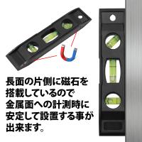 | 【注意 必ずご確認ください】 | ・強い衝撃などで気泡管が破損すると溶液が漏れ出す恐れがあるので、取り扱いに注意してください。 ・気泡管には通常蒸発しない溶液が入っていますが明らかに泡が大きくなってきたり溶液が減少している場合、気泡管が破損している可能性があります。 ・長面の片側にゴム磁石が付いていますが、金属面であっても金属素材によってはくっつきにくい場合があります。 | |