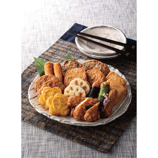 ◇内容 ●特揚げ棒天・いわし棒天・おいも天×各4、ごぼう天・にんじん天・れんこん天・枝豆天・五目揚・梅おはら揚×各2、のり巻・しそ巻×各1(11種26個)