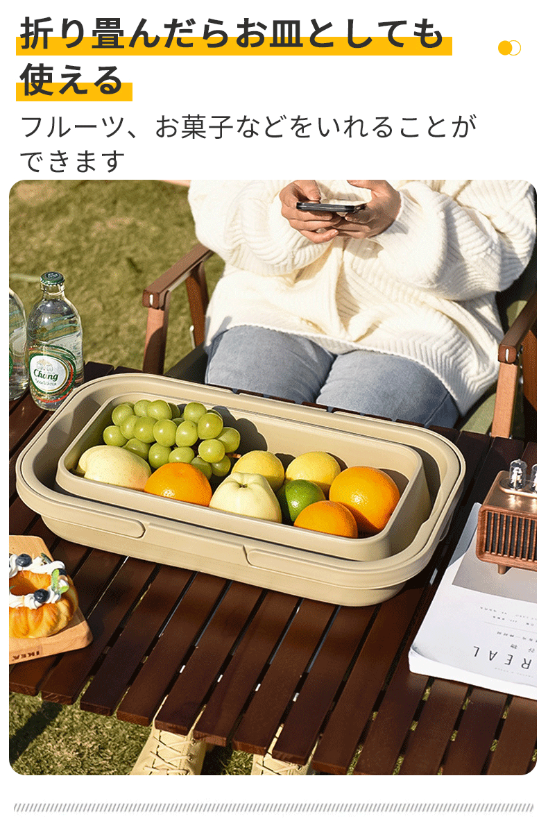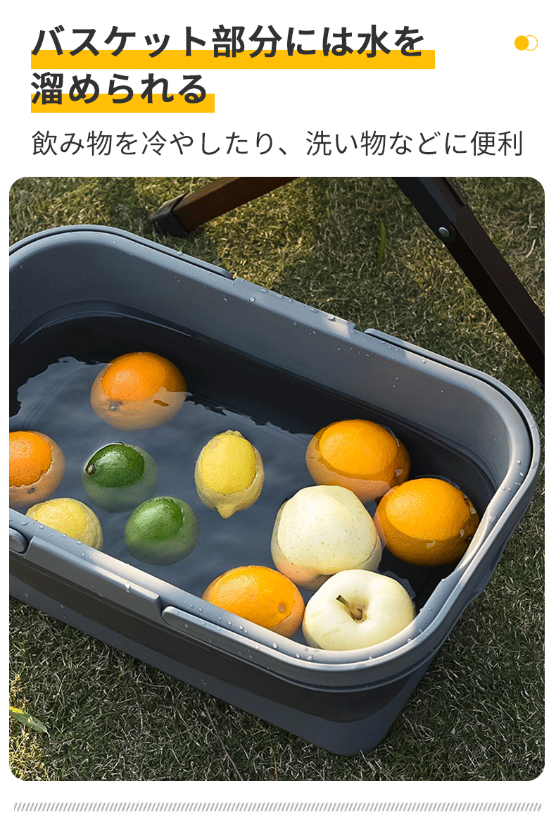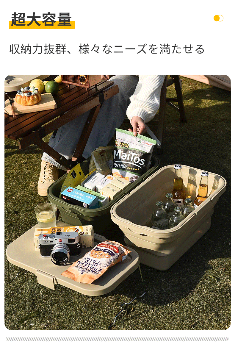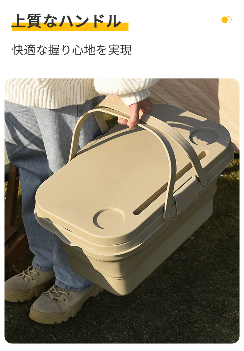 たっぷり入る大容量ながら、使用しないときはコンパクトに折りたたんで収納できるため、持ち運びや車載収納にも便利で、アウトドアから日常使いまで幅広く活躍します。