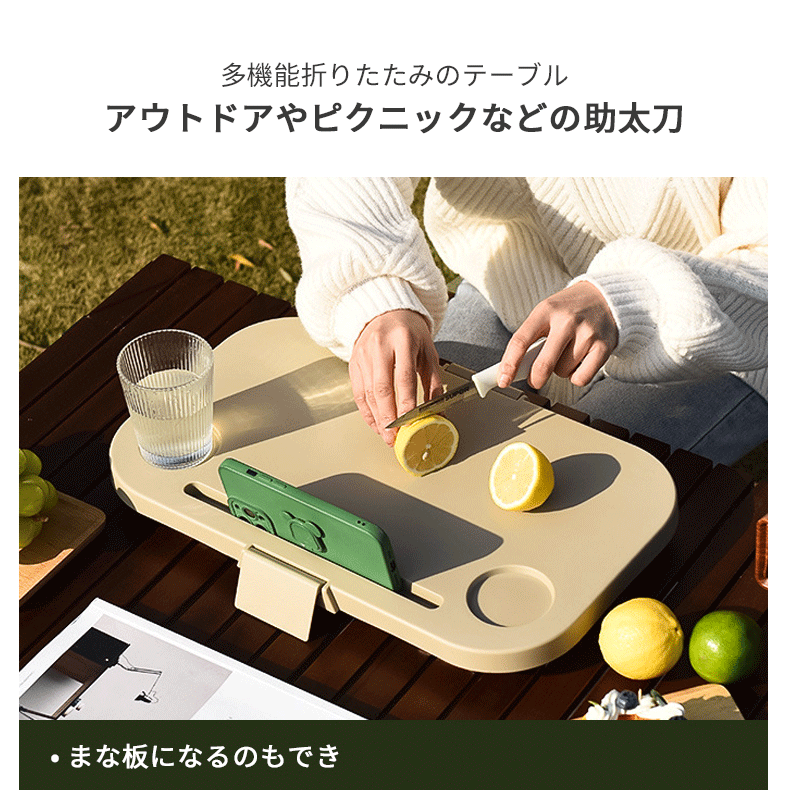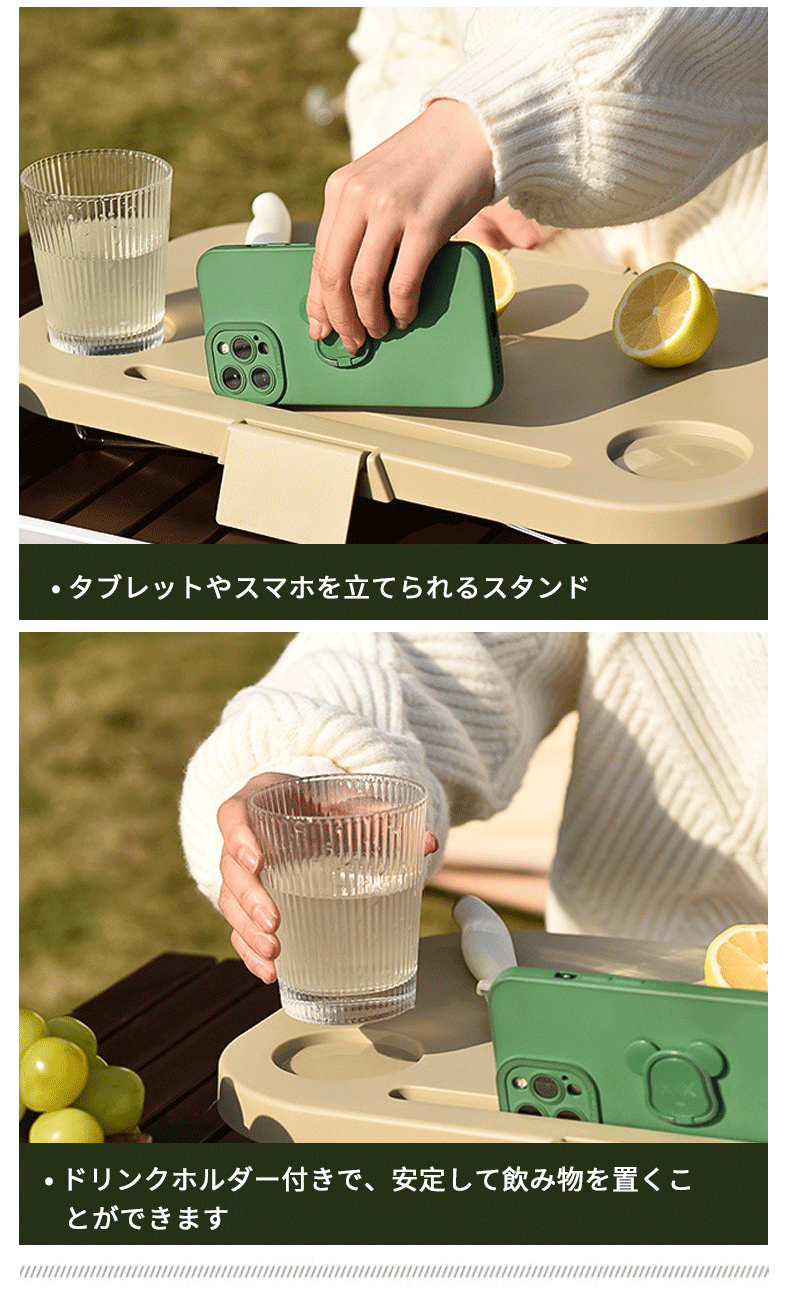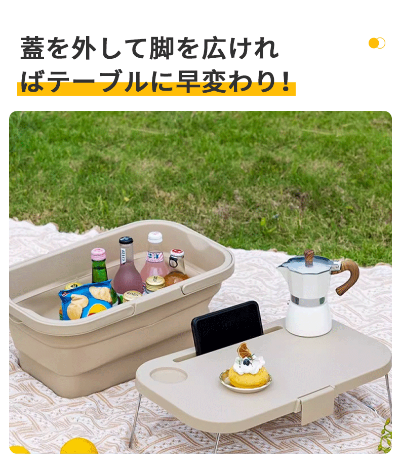 フタを外せば簡易テーブルとしても使える便利な設計で、中央にはドリンクホルダーやスマホスタンドも付いており、ピクニックやキャンプ、お花見など屋外での食事や休憩をさらに快適に楽しめます。