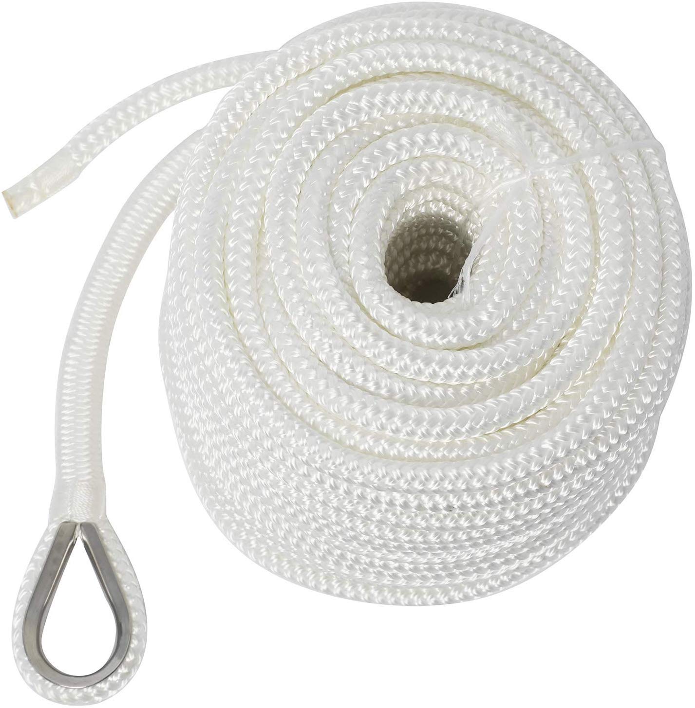 NovelBee 3/8インチ x 50フィート ダブルブレイドナイロンアンカーライン シンブル付き NovelBee 3/8" x 50' Double Braid Nylon Anchor Line with Thimble (White)