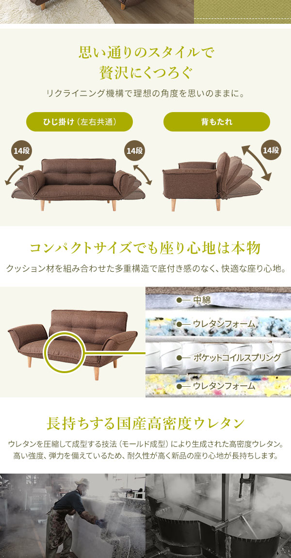 ・通常130cmとコンパクトな横幅なのに、肘掛けを倒すことで最大168cmまで広がります。