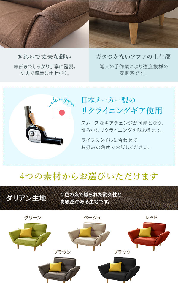 ・きれいで丈夫な縫合や、ガタつかないソファの土台部分が国産ならではです。