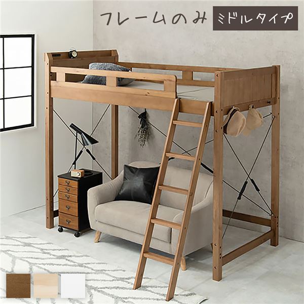 【商品名】 ロフトベッド シングル ミドルタイプ 床下113cm ベッドフレームのみ すのこ仕様 木製 天然木 宮付き 棚付き 2口 コンセント付き ロフトベット 【ジャンル・特徴】 ベッド ベッドフレーム 寝具 ベット ベットフレーム インテリア家具 ベッドルーム 寝室 子供部屋 引っ越し 引越し 引越 新居 新生活 1人暮らし プレゼント 贈り物 ギフト 進学 就職 べっど べっと 子ども部屋 こども部屋 進級 入学 お祝い 勉強部屋 学習机