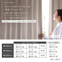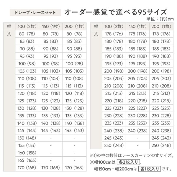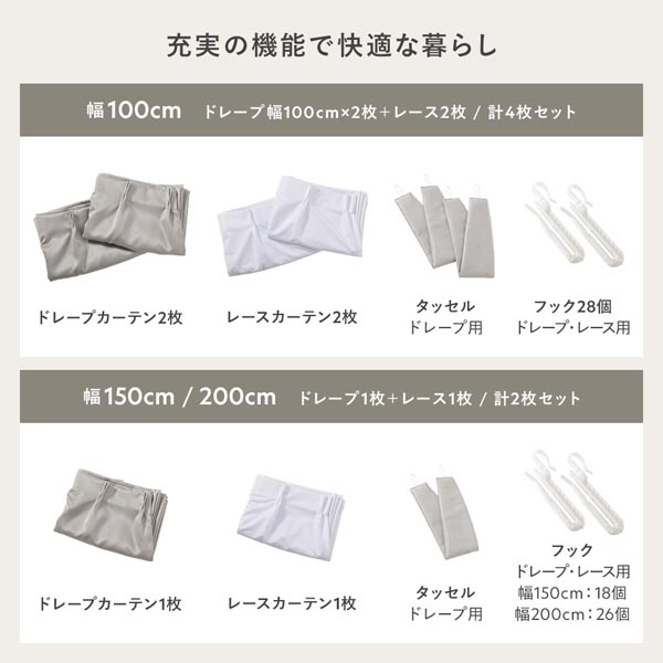 ・幅100cmはドレープ・レースカーテン各2枚入り(幅100cmのドレープカーテン×2枚、幅100cmのレースカーテン×2枚 計4枚セット)、幅150・200cmはドレープ・レースカーテン各1枚入り(計2枚セット)です。