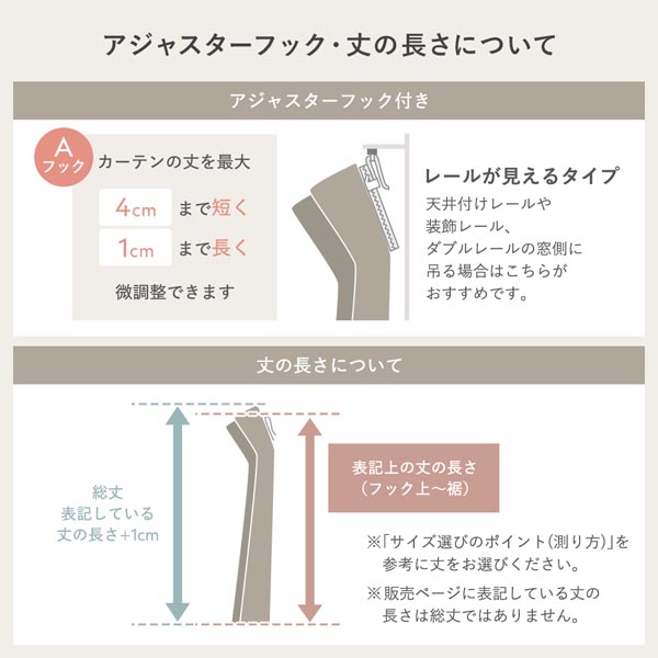 ・販売ページに表記している丈の長さはフック上〜裾になります。総丈ではありませんのでご注意ください。