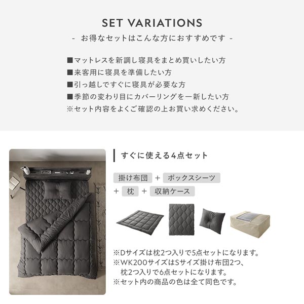 セミダブル(4点セット):掛け布団×1 + 枕×1 + ボックスシーツ×1 + 収納ケース×1