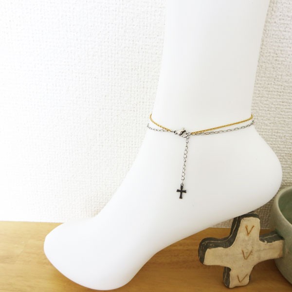 2連チェーンアンクレット ロング小豆2mm幅 x 小豆 ゴールド 幅1.6mm ステンレスアクセサリー ステンレスチェーンアンクレット アジャスター付き