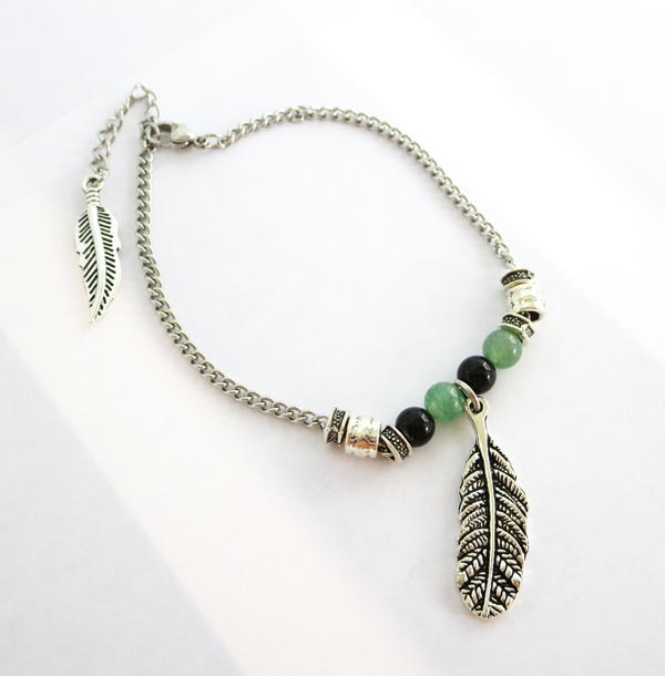 パワーストーン 合金チャーム フェザーアンクレット オニキス&アベンチュリン 6mm玉 FN40