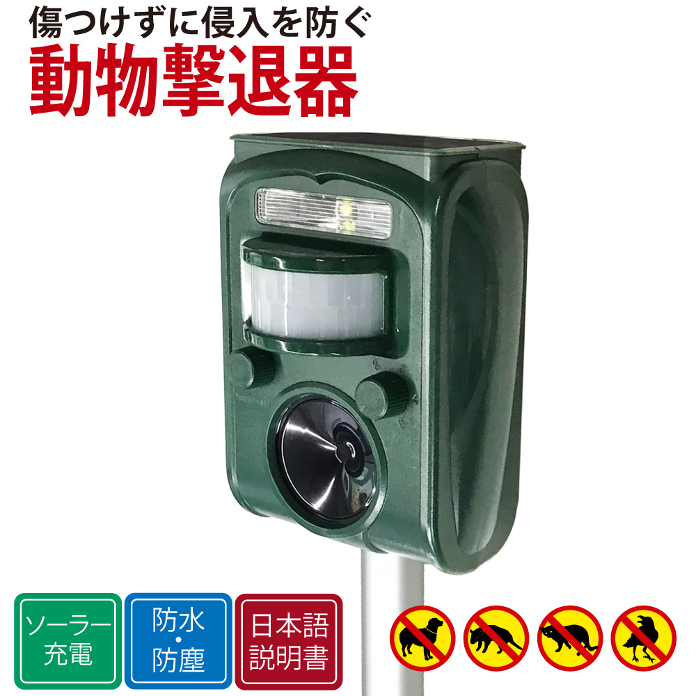 改良版登場! 改良点は4つ 1.内部構造の改良により防水性能がアップ。 それによる長寿命化も実現しています。 2.超音波の性質がアップ。 従来品の60dBから80dBに向上しています。 3.LEDチップの改良 STMタイプのチップを搭載。 これにより、安定発光と長寿命化を実現。 4.超音波と警告音で効果的に害獣を撃退! ※警告音発生時は超音波は出ません。同時にご利用の場合は 複数台設置などでご対応ください。 音波や光で動物をよせつけない! 2つのコントロールボタンでセンサー感知範囲設定 稼動モードの選択が可能です 動物を怪我させずに追い払うソーラー式ガーディアン 防滴構造で雨天使用可能 土面に突き刺すか掛けたりできる簡単設置です。 太陽光パネル搭載のソーラー式だから 配線や電源の心配をする必要もいりません。 ※動物の個体差や環境の違いにより効果が見られない場合がございます。予めご了承ください。 ※動物による危害や天災などの外的要因による破損・不具合などについては保証の対象外となります。 商品サイズ:(約)12.9×9.6×9cm 高さ:38cm 重量:350g 感知距離 8m / 110°/ 水平 (天候により変動) 防水等級:IPX4 電源 ソーラーパネル:充電式電池 800MA (3×AA 1.2V)付属 ※本製品は急速充電非対応です。 別途ACアダプター、コンセントタップなどと接続してUSB充電を行う場合は 出力定格電圧5V、出力定格電流2A以下の製品と接続して充電を行ってください。 ※急速充電によって製品不具合が起きる場合は保証対象外です。 |