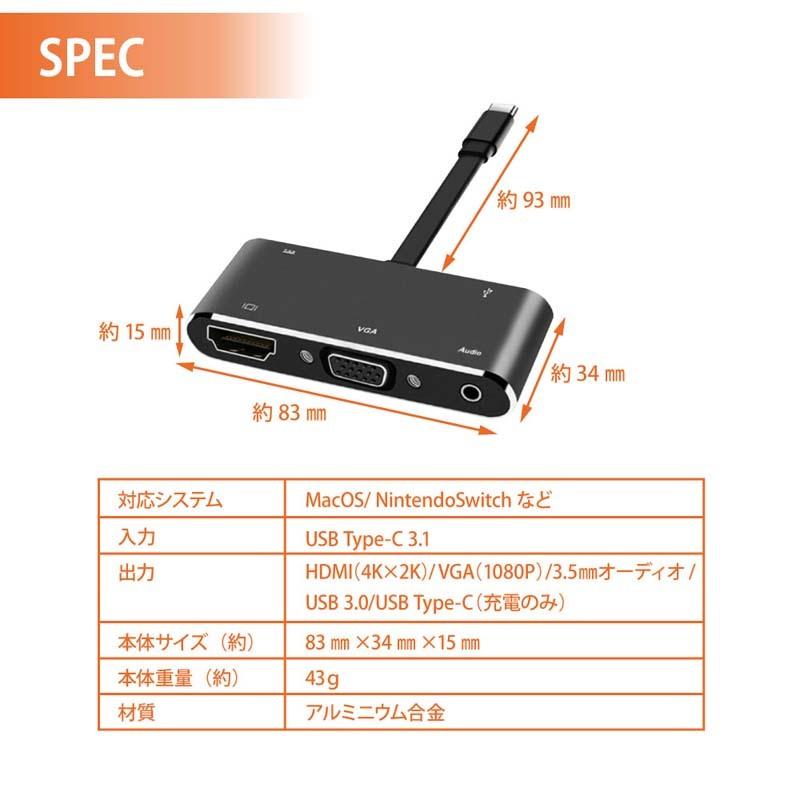 | ■入力:USB-TypeC 3.1 ■出力:HDMI(4K×2K)、VGA(1080P)、3.5mmオーディオ、USB 3.0ポート、タイプ-C PDポート(充電のみ) ■5in1マルチポートアダプター ■ Nitendo Switchの映像出力に対応。※Nintendo Switchに付属の純正ACアダプター(別売り)での給電が必要となります。 ※ Nitendo Switch liteでは出力できませんのでご注意ください。 ■ HDMI出力解像度は最大3840x2160P @30Hz Ultra HD、VGA出力は最大1080x1920P Full HDに対応。 ■ USB Type-Cポートで映像出力可能なデバイスを、HDMI対応またはVGA対応のテレビ、モニター、プロジェクターに接続し、大きな画面で高画質の映像をお楽しみいただけます。 ■ HDMI出力の場合、音声も同時に出力できます。VGA出力は、映像のみとなりますので、オーディオ端子を使用することで音声出力できます。 ■PC/スマートフォンに接続の場合、USB 3.0ポートはキーボード、マウス、フラッシュディスクなどに接続し、USBハブとして使用できます。 ■互換性:MacBook 2015/2016/2017、MacBook Pro 2016/2017、Samsung Galaxy S8/S9 note8、DELL XPS 13/15 P83G001、Google 950/950 XL、Huawei Mate 10/10 pro/P20、Lenovo Thinkpad T470/YOGA 5 pro/6 pro、Nintendo Switch、その他のUSB-Cでの映像出力に対応したデバイスに使用いただけます。 ■ 仕様 サイズ(約):横83mm×縦34mm×厚さ15mm ケーブル長さ(約):93mm 重量:約43g 材質:アルミニウム合金 インターフェイス:HDMI、VGA、3.5mmオーディオ、Type-C(PD電源)、USB3.0 HDMI出力解像度:最大3840×2160P UHD 4K @30Hz VGA出力解像度:最大1920×1080P FHD ・ 説明書の付属なし。 ・上記内容はすべての機器、環境、サービスに対応を保証するものではありません。 ・大きな電力を使用する機器は、電力不足となり、使用頂けない場合があります。 ・個別の環境に対する動作可否は保証対象外です。 ・商品説明内の画像はイメージです。 ・本商品は任天堂のライセンス商品ではありません。 ・本商品にSwitch本体やHDMIケーブル、ACアダプター等は付属いたしません。 保証期間:ご購入日から半年 製造国:中国 ※ ご利用のモニターによって、実物と異なる色に表示される場合がございます。 ※ 製造時期によりデザインや仕様に若干の変更がある場合がございます。ご了承ください。 こちらの商品の無料発送はゆうパケットのみとなります。 ゆうパケットを希望される場合、代金引換・日時指定はご対応できませんのでご注意ください。 代金引換での決済を希望された場合、ゆうパケットではなく通常宅配便として発送いたします。 その場合送料660円と代引き手数料330円を追加で請求させていただきます。 ※沖縄、離島の場合 代金引換での決済の送料が1320円となります。 DP Alt 対応機種
