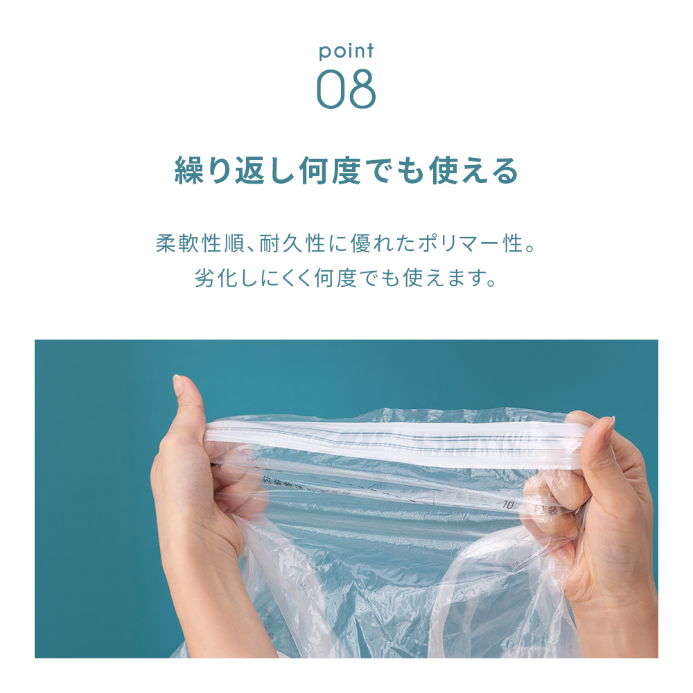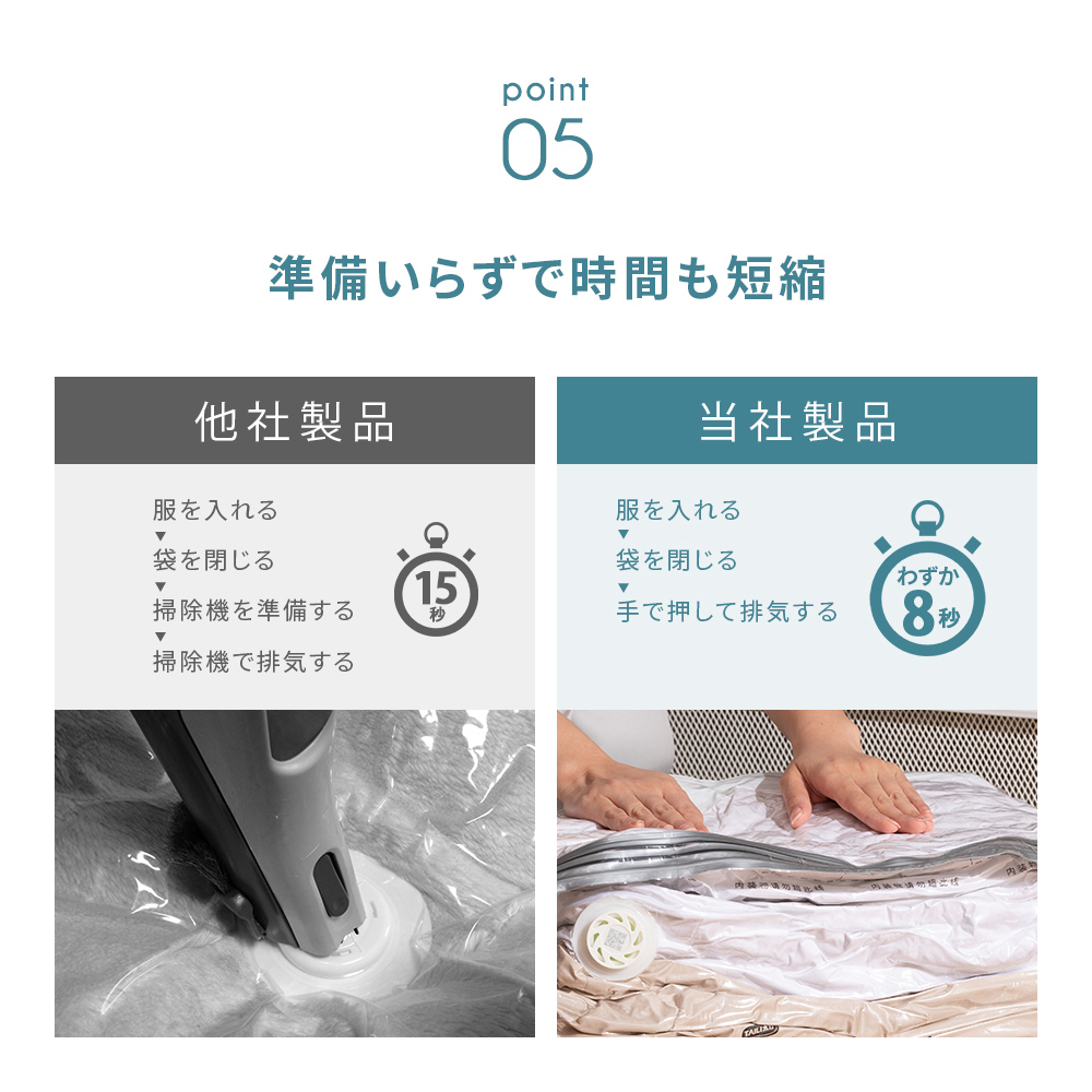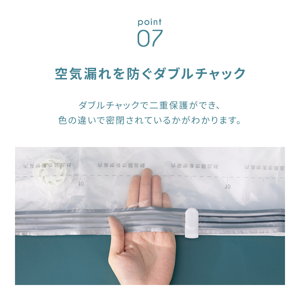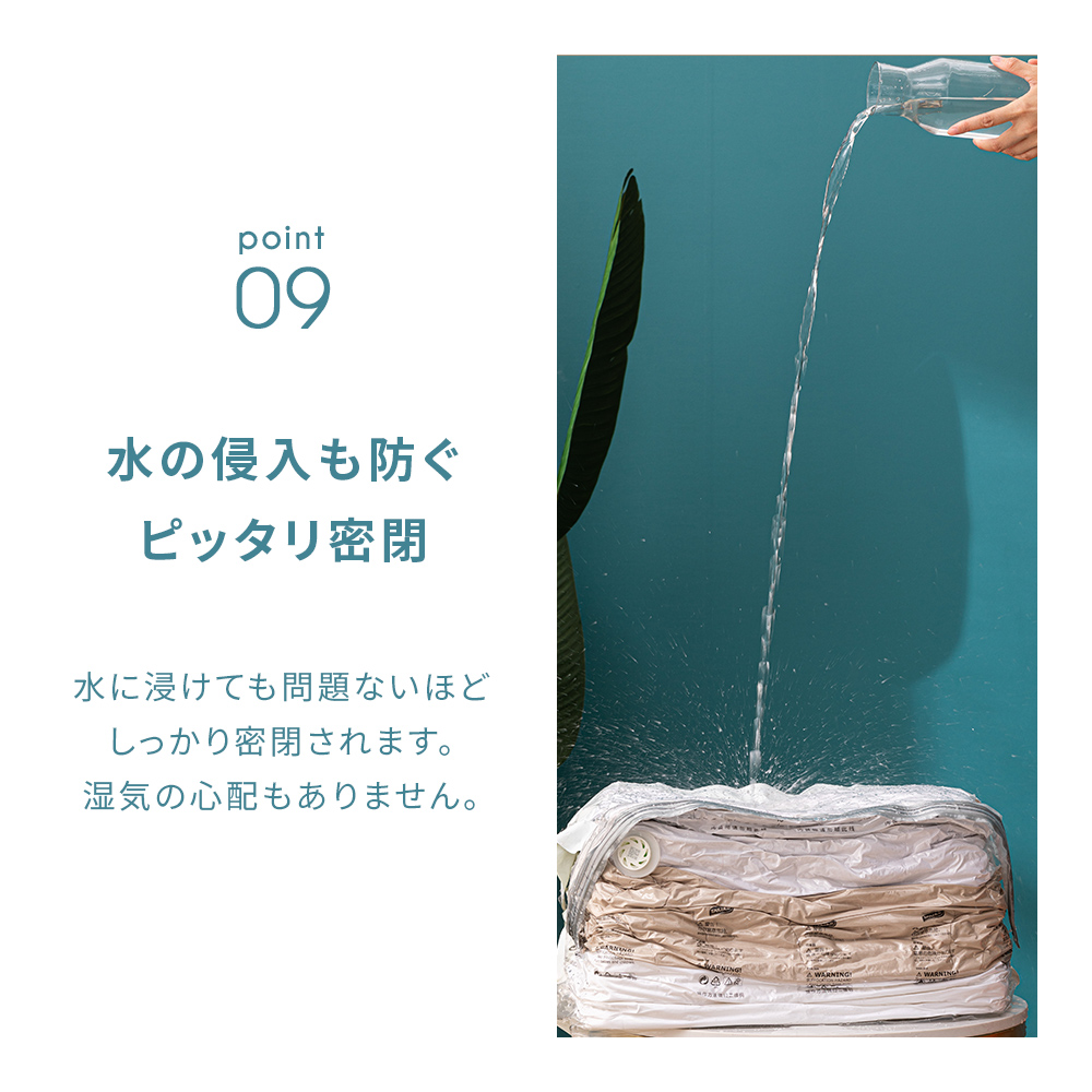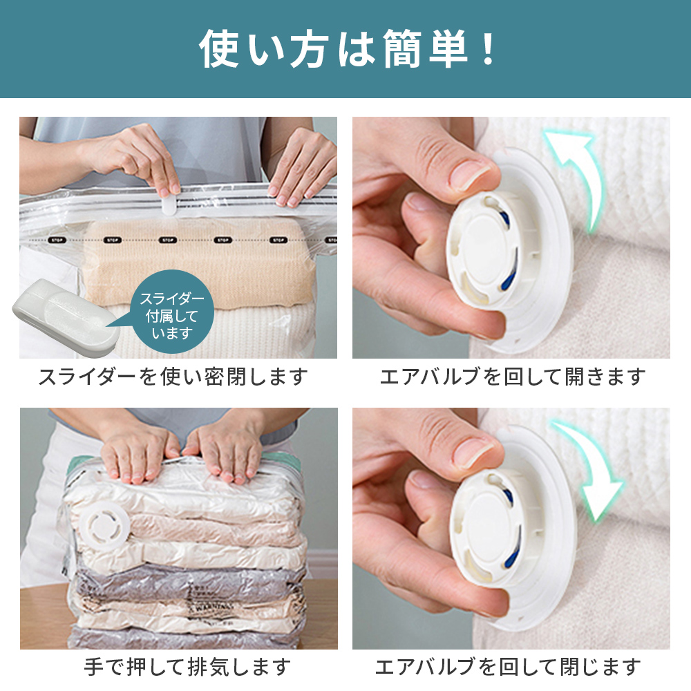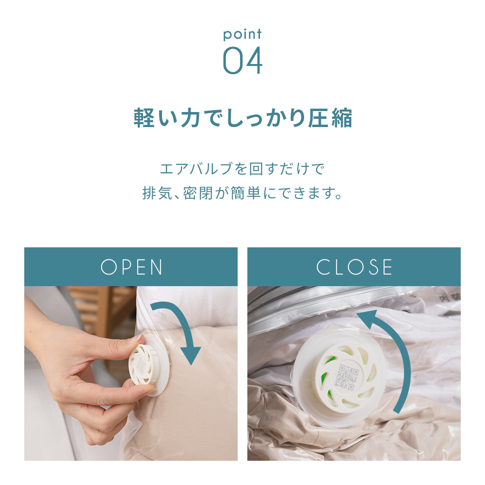 ポンプや掃除機が不要で手で押すだけでしっかり簡単に圧縮できます。