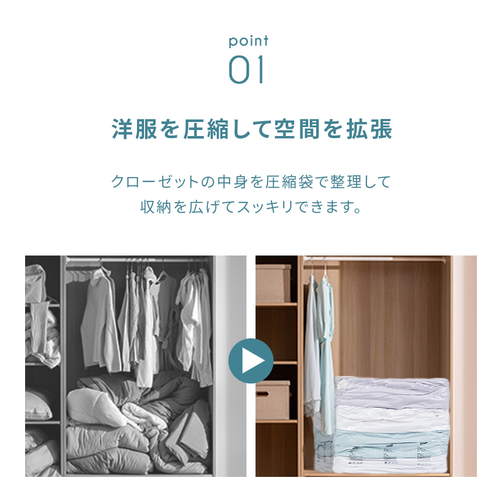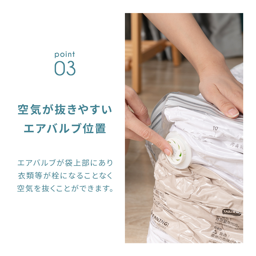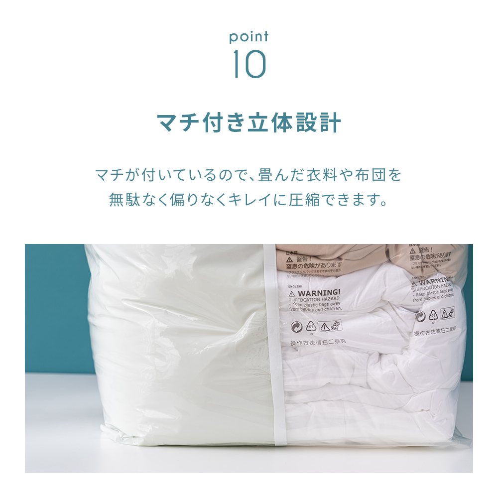 かさばる衣類や毛布などもお手軽に圧縮し驚くくらいの省スペース。