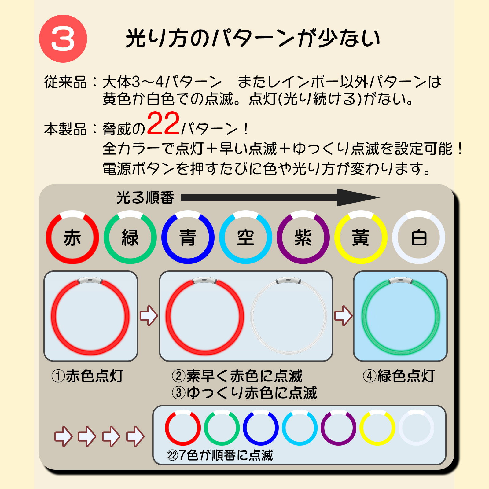 どこをカットしても光る安心構造、きらきら可愛い22パターンの発光、防塵防水IP67で雨の日もバッチリ。