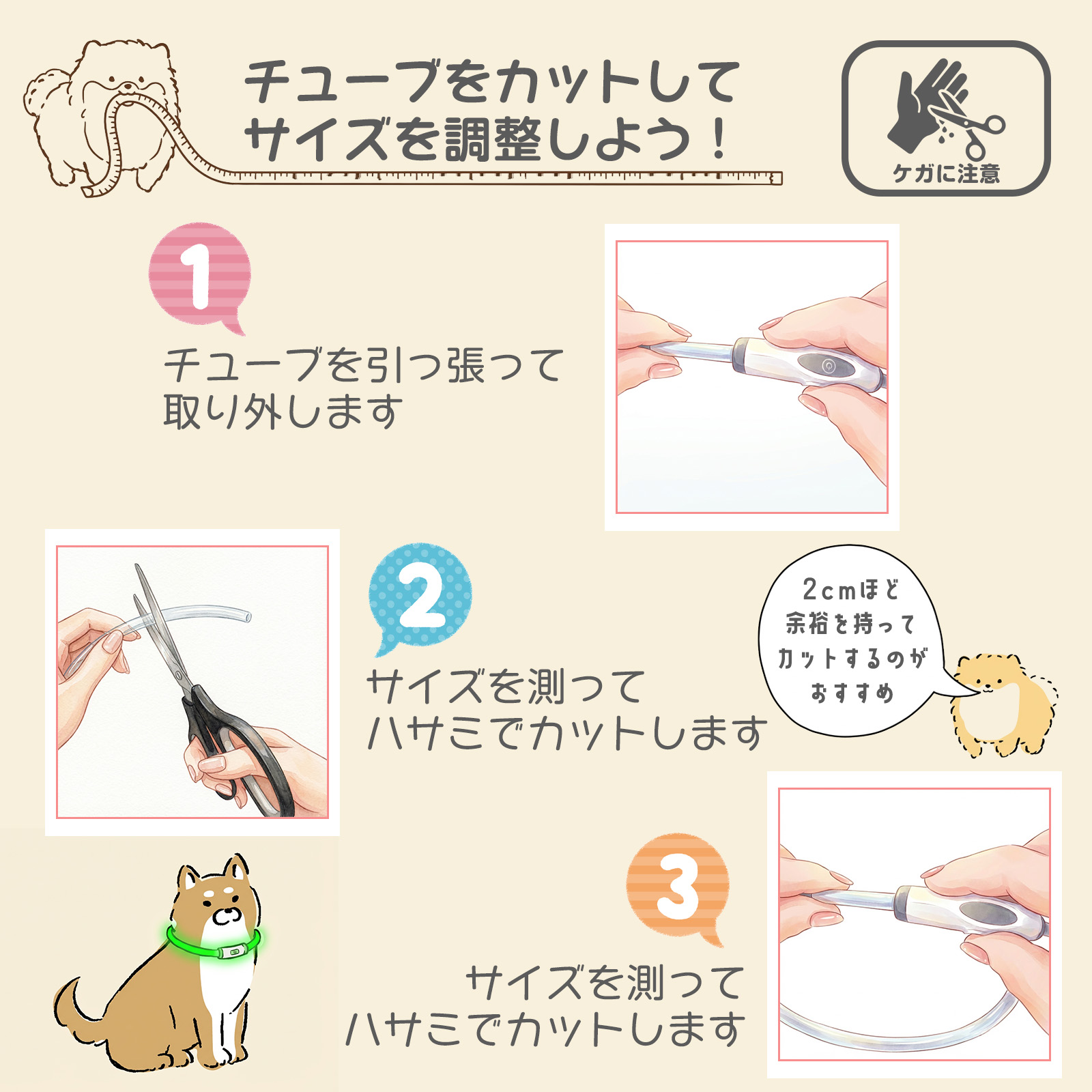 「暗いとちょっと不安…」「誰でも簡単に長さをカットできるようにしてほしい…」「いろんな色に光らせたい…」そんな飼い主さんの声から生まれた、光る首輪です。