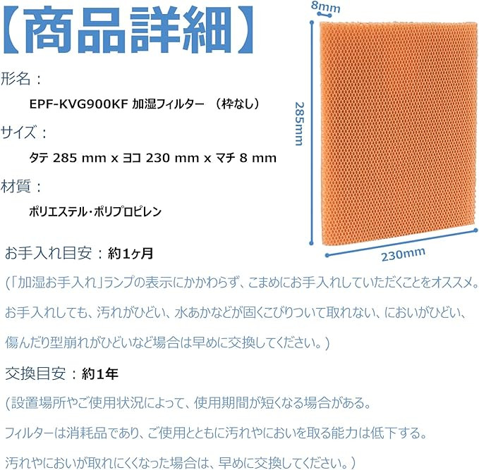 EPF-KVG900KF 加湿フィルター フィルター 加湿空気清浄機 交換用加湿フィルター 気化フィルター 空気清浄機 EP-KVG700 EP-LVG110 対応 枠なし【互換品】 爆買