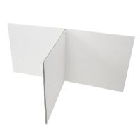 | デスクの幅に合わせて調節が可能なコの字型のパーテーション。高さは60cm固定で、長さは60〜120cmまで調節できます。 | 両面ホワイトのため設置した際の圧迫感が少なく、明るくて開放的な印象です。オフィスやご自宅の空間を仕切り、プライバシーの保護や飛沫感染防止に役立ちます。 | ダブルクリップやテープ留めで簡単に固定ができて、使用しない際には折りたたんでコンパクトに収納可能です。ダンボール製のため、古紙回収にも出せます。 |