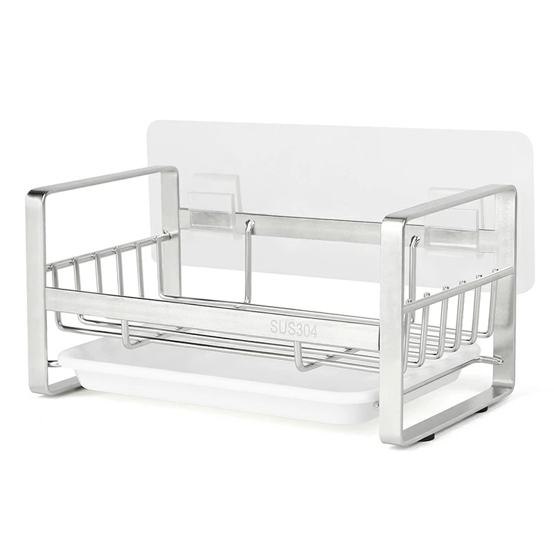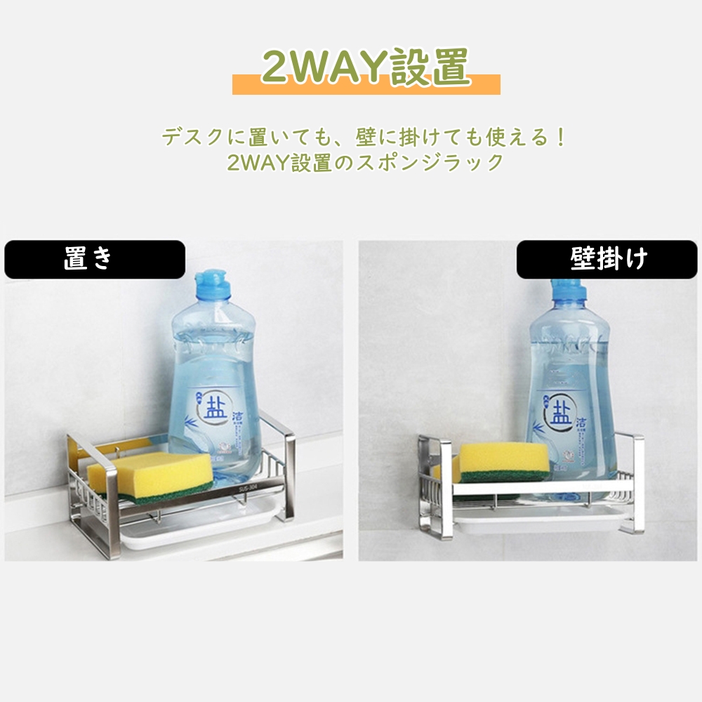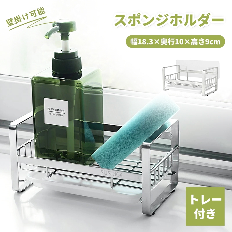 スポンジホルダー ステンレス スポンジラック キッチン 強力粘着テープ付 壁掛け可能 スポンジ・ボトル置き スリム洗剤置き 台所整理 水切りラック トレー付
