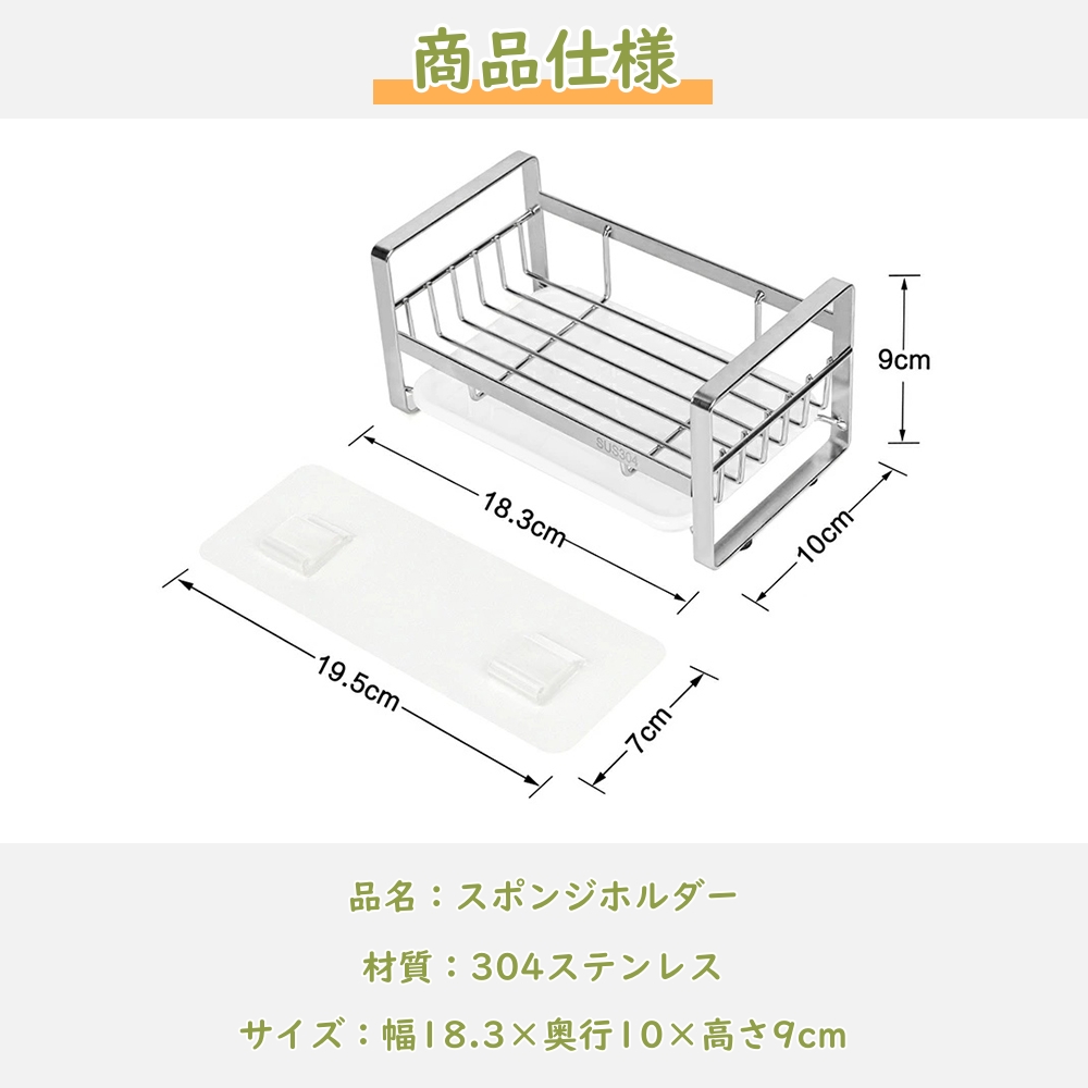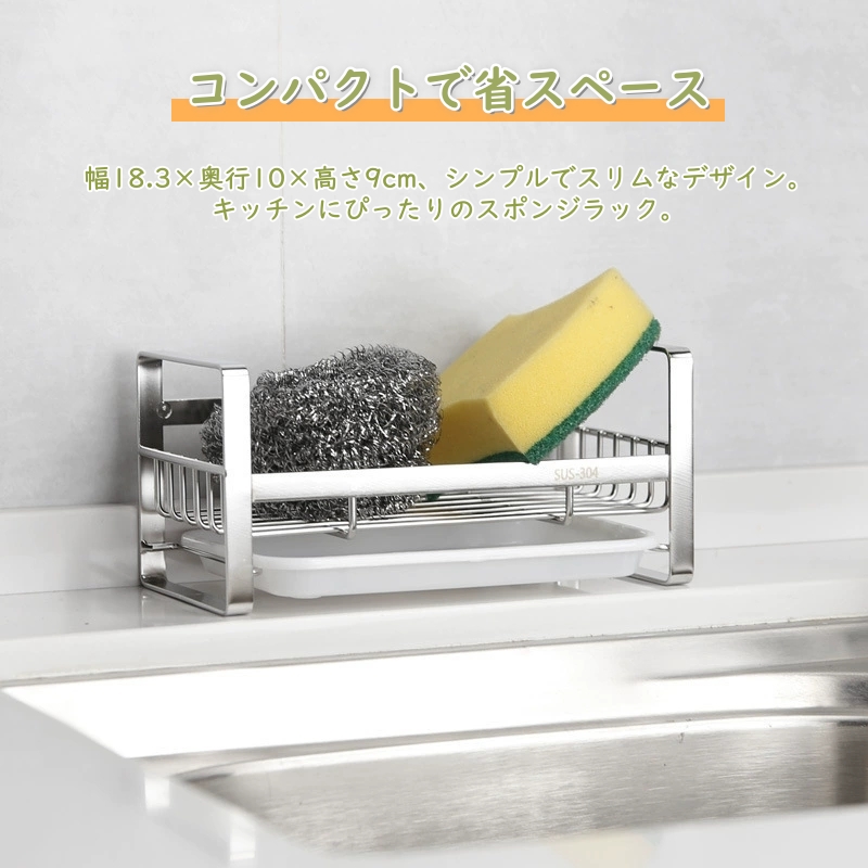 【コンパクトで省スペース】幅18.3×奥行10×高さ9cm、スリムでシンプルなデザイン。キッチンシンク周りにぴったりなスポンジラックで、スポンジや洗剤ボトルをスッキリ収納できます。